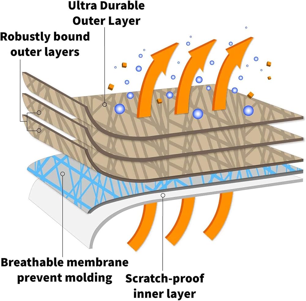 • Structure of 5 Bonded Layers; heavy-duty outer layer; double cushioning padded layer; protective supporting layer(layer 1, 2, 3 is robustly bonded with a high level of adhesion.); soft non-scratch inner layer (fleece lining).