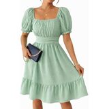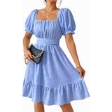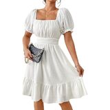 Design: Flattering square neck; chic puff short sleeve; defined high waist; classic a line silhouette; versatile knee length; playful ruffle flounce hem; adjustable tie back knot detail; stylish tiered dress for women; delicate swiss dot pattern.