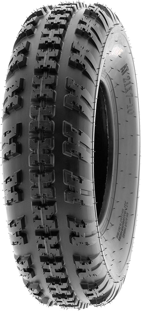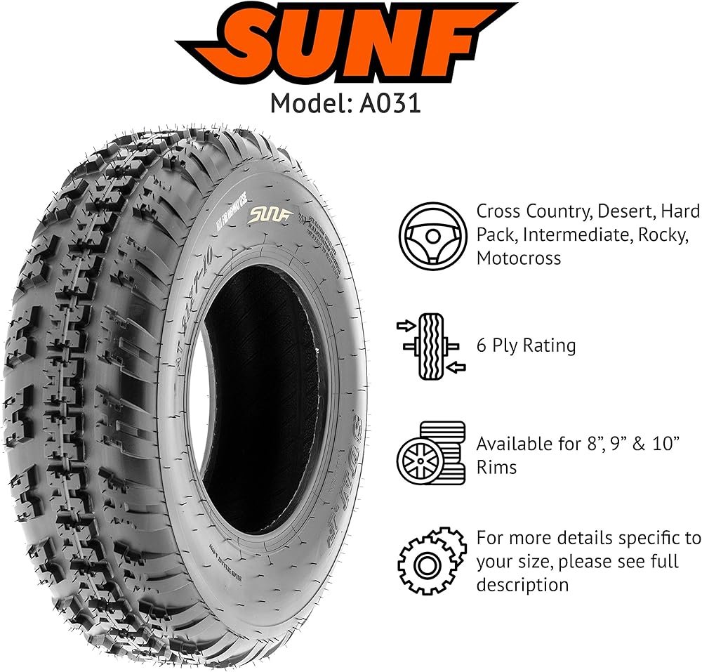 SunF Corporation has dedicated themselves to meeting their customer's demands and needs. SunF develops and manufactures a wide variety of quality tires in the specialty market. Their line up includes ST trailer, lawn and garden, agriculture, golf cart, ATV Quad Motorcycle, UTV Side by Side, light truck & more!The SUNF A031 ATV tire showcases a specialized directional "X" tread pattern, optimized for exceptional all-terrain and racing performance, delivering superior traction and stability.All-Terrain Racing Capability: Engineered to excel across various terrains, including mud, sand, and rough tracks, the A021 tire offers consistent and dependable performance for off-road racers seeking versatile traction.Durable 6 Ply Construction: Crafted with a robust 6-ply construction, the A031 tire is designed for durability, effectively resisting punctures, cuts, and impacts to withstand the rigorous demands of racing and off-road conditions.Shoulder Traction Technology: Equipped with advanced shoulder traction technology, the A031 tire ensures exceptional grip during high-speed turns and challenging maneuvers on diverse terrains, enhancing off-road control for racing enthusiasts.Wide Size Range: Available in sizes ranging from 18 to 22 inches, the SUNF A031 tire accommodates a variety of ATV models and rider preferences, ensuring a customized fit for various racing setups and performance requirements.Size 1: 20x6-10