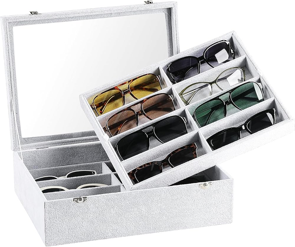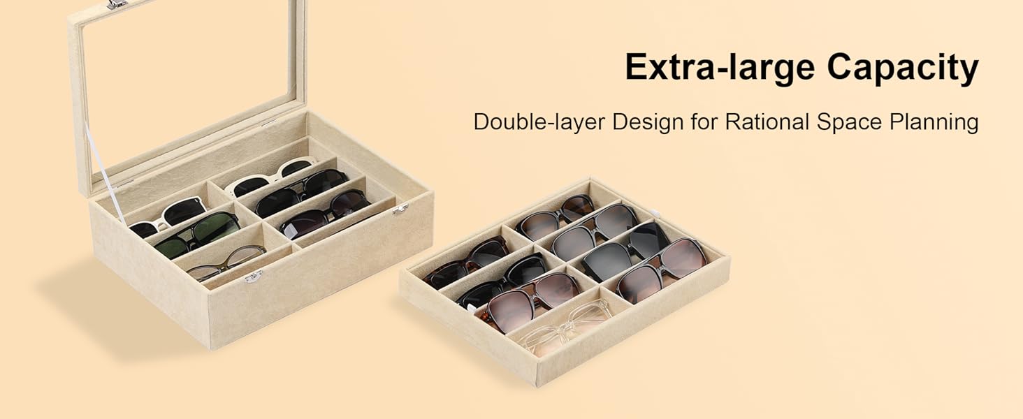 2 Layer Sunglass Storage:This tray Holds up to 16 pairs of sunglasses in 2 Layer 8 slots per layer,each measuring approximately 6.3"*2.1",helping you saving valuable drawer or closet space.Ideal for sunglass enthusiasts with multiple designer pairs