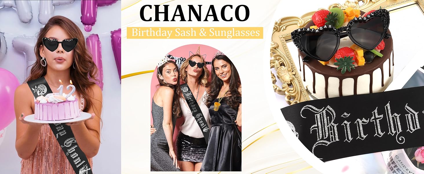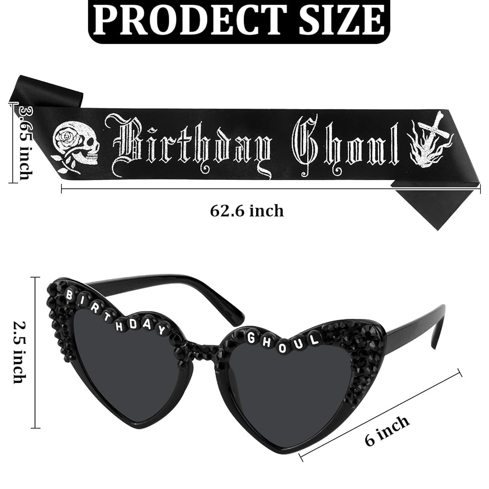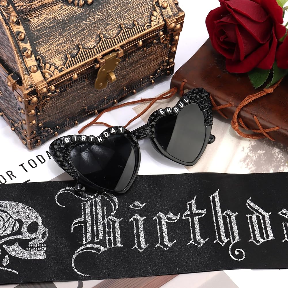Chanaco Birthday Sash for Women Goth Birthday Party Decorations for Girls Black Ghoul Sash and Heart Sunglasses Spooky Emo Horror Gothic Gifts Halloween Accessories