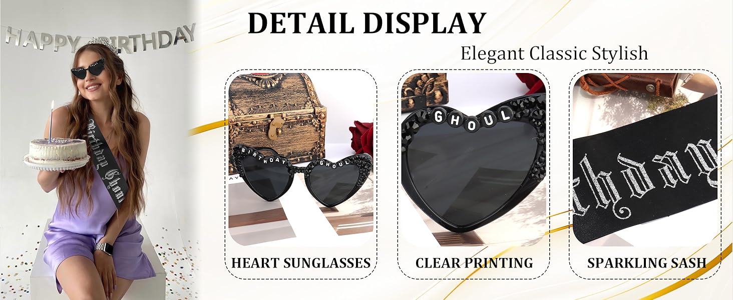 Item: This set includes a beautifully crafted "BIRTHDAY GHOUL" sunglasses and a birthday ghoul sash. It's suitable for celebrating Halloween birthday.