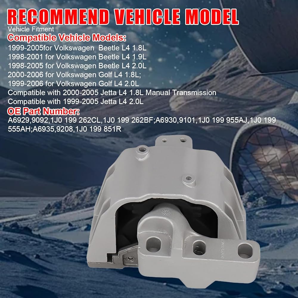 Compatible Vehicle Models: Compatible with Volkswagen Beetle 1998-2005 (1.8L/1.9L/2.0L), for Golf 1999-2006 (1.8L/2.0L), Compatible with Jetta 2000-2005 L4 1.8L(Manual Transmission), Compatible with Jetta 1999-2005 L4 2.0L.(Attention:Please confirm the engine mount PART NUMBER/MAKE/MODEL/YEAR before purchasing to ensure it fits your vehicle)