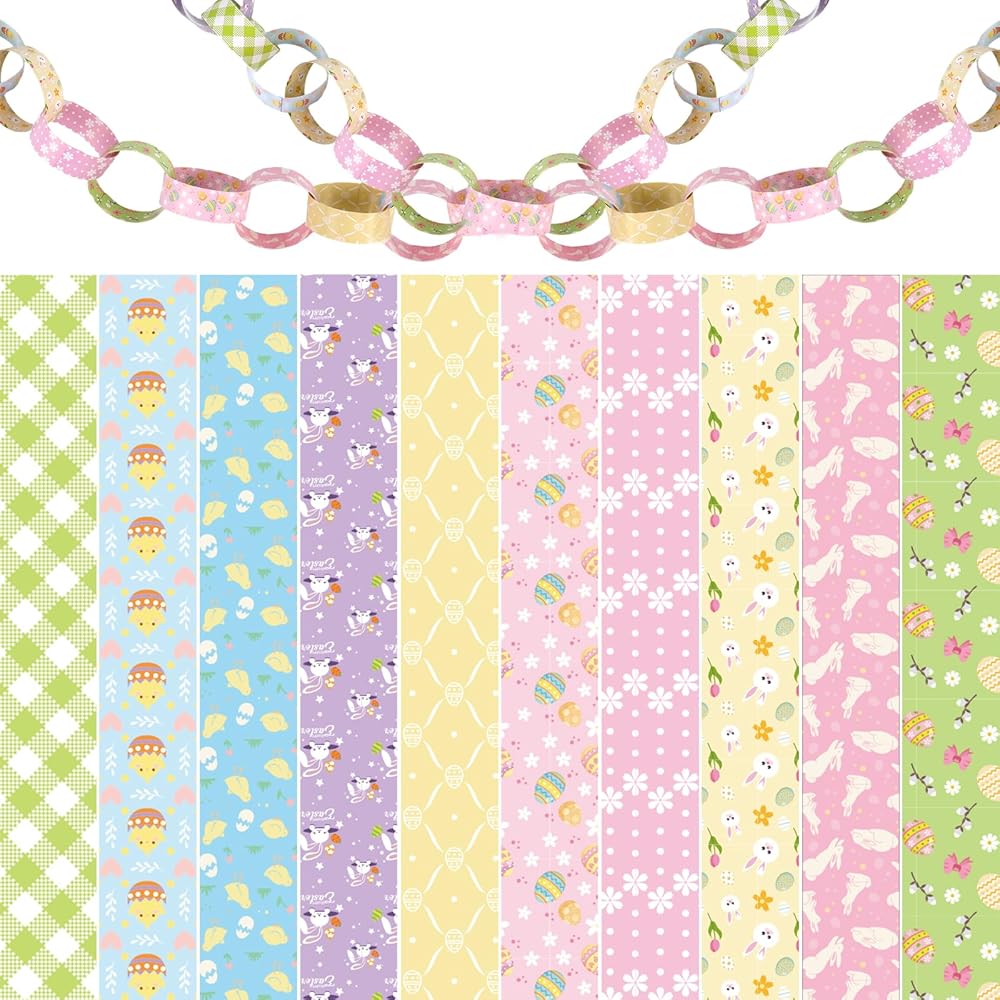 Create a festive and vibrant atmosphere for Easter with the TAKEALOOKO Paper Chain! This huge set includes 600 pre-cut paper strips in cheerful spring colors, featuring adorable bunny and classic Easter patterns. Easy and fun to assemble, these chains are perfect for crafting long, beautiful to decorate your home, classroom, or party venue. Made from quality cardstock, they offer a simple yet impactful DIY decoration project for families, teachers, and kids. Transform any space into a joyful celebration with this classic, reusable, and versatile holiday decoration supply.