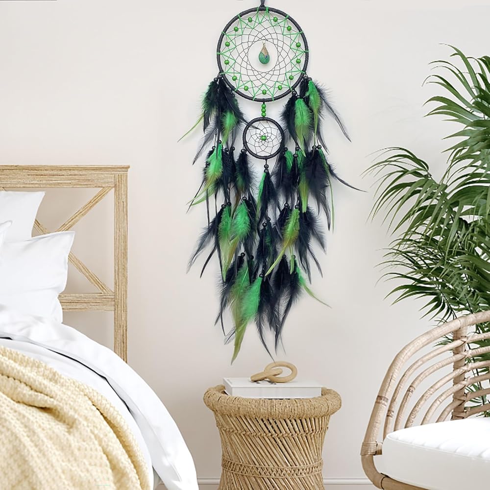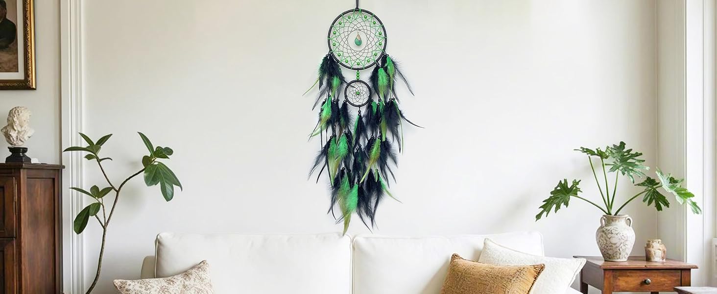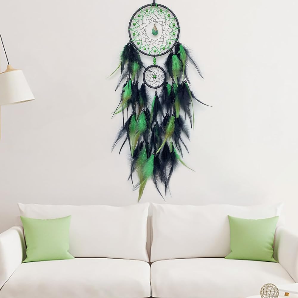 Black and Green Dream Catcher Wall Decor Feather Dream Catchers with Pendant Handmade Dreamcatcher Wall Hanging Ornament for Bedroom Living Room Home Decor