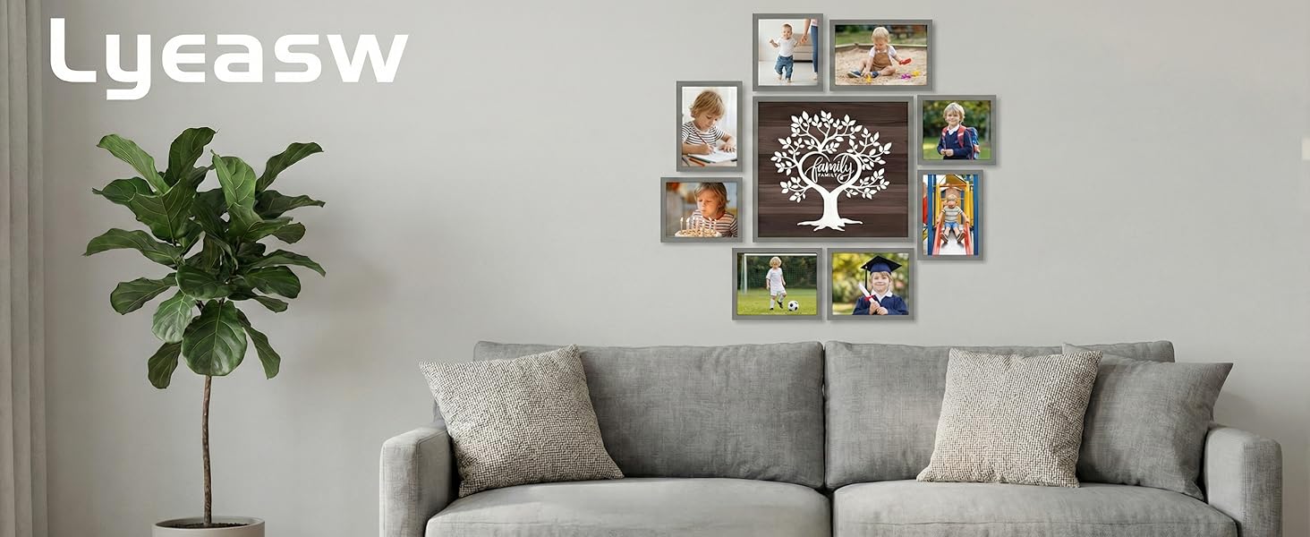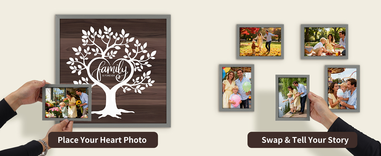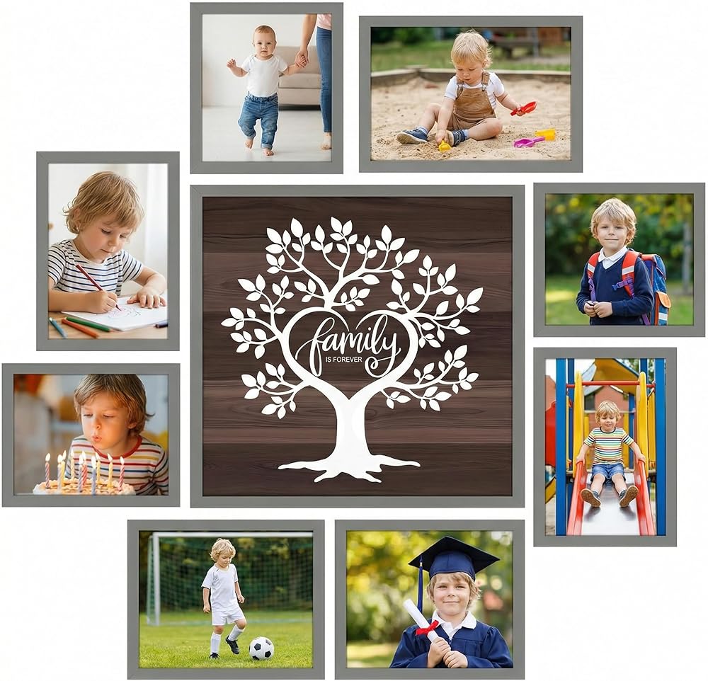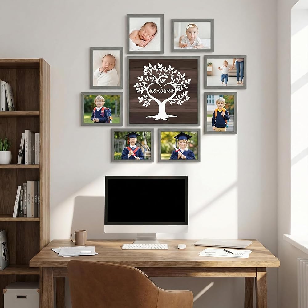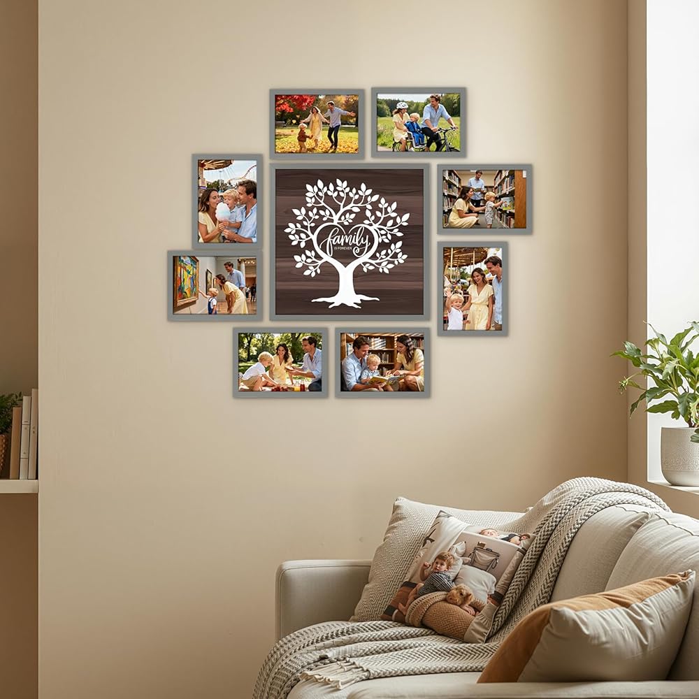Your Family Story Wall: Features a pre-printed 12x12" life tree anchoring your photo frames for wall collage, with eight 5x7" frames for a complete gallery.