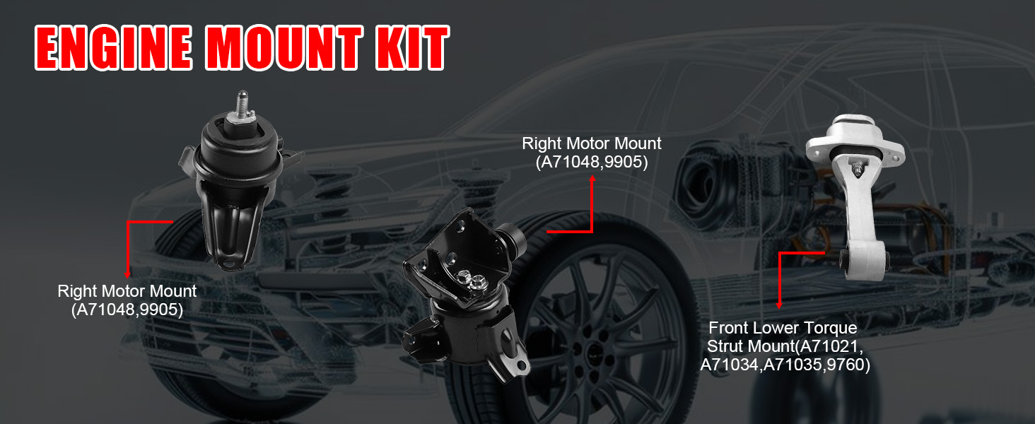 Package Included:1x Right Motor Mount(A71048,9905),1x Left Transmission Mount(A71009,9779),1x Front Lower Torque Strut Mount(A71021,A71034,A71035,9760)