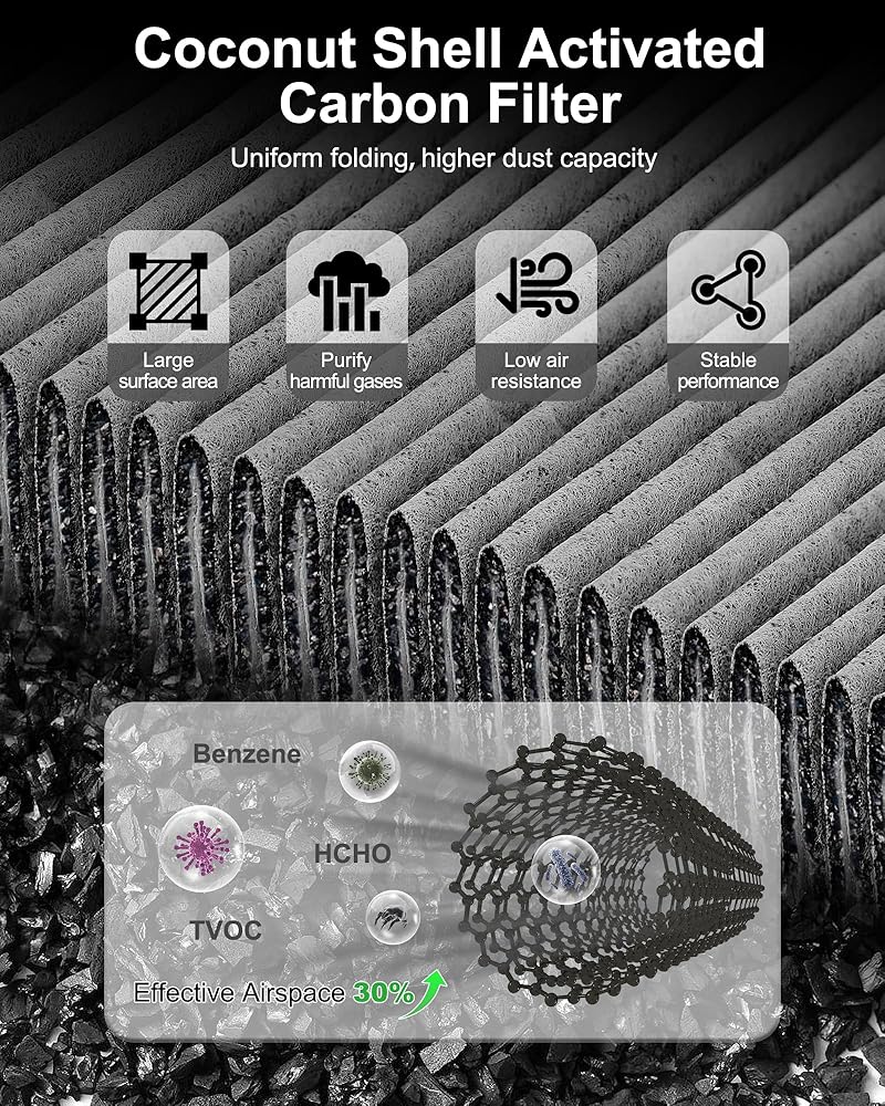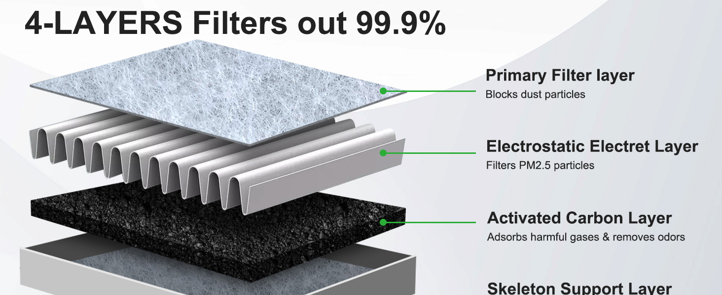 4-Stage Cabin Protection: Features a PET long fiber layer, spongy dust-holding layer, activated carbon layer, and meltblown layer—capturing up to 99% of airborne particles including dust, pollen, soot, and odors. Helps keep cabin air fresh and clean, creating a healthier environment for you and your passengers.