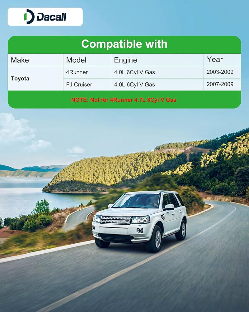 Fit for Toyota Model: Dacall Cabin & Engine Air Filter Set fits for Toyota 4Runner V6 4.0LGas 2003-2009(Not for 4.7L), FJ Cruiser V6 4.0L Gas(2007-2009). Note: Please check Amazon's ‘Confirmed Fit' tool before purchase to ensure proper fitment.