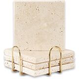 4pcs 4" Travertine Marble Coasters for Drinks Natural Coasters Set,Square of Stone Drink with Gold Cup Holder,Non Slip Cork Backing,Protect Tables from Stains Scratches Housewarming Gift, Wedding