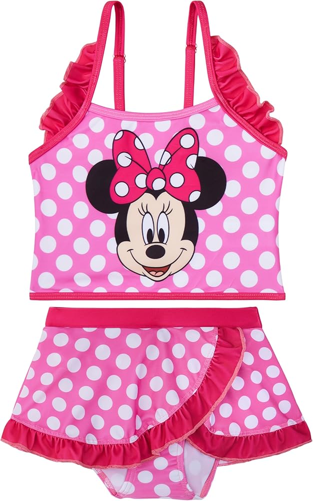 Make every splash a little more magical with these Disney swimsuit for kids inspired by Minnie Mouse and Stitch. Bright colors and playful character prints bring extra excitement to pool days, beach adventures, and sunny family vacations. These cheerful designs add a fun twist to warm-weather wardrobes while fitting right into toddlers or teen girl bathing suits collections. The range includes two playful swim styles so kids can enjoy the look they love most. Some designs feature a two-piece bikini for girls set with a swim top and a matching skirt with built-in briefs, offering a cute layered style for water fun. Other options include a classic two-piece look with a bikini-style top and coordinating bottoms. Together, these styles bring variety to girls and teen bikinis and relaxed tankini swimsuits girls inspired outfits that feel ready for every summer adventure. Made from a flexible recycled polyester and elastane blend, these bathing suit for girls allow kids to move comfortably as they swim, splash, and play. Adjustable shoulder straps of these bathing suit for teen girls help create a secure fit during active water time. Whether it's building sandcastles, jumping into the pool, or running along the shoreline, the stretch fabric helps make every moment feel easy and carefree. The Minnie Mouse little girl swimsuit is designed with younger swimmers in mind, while the Stitch designs extend into sizes for older kids, creating colorful options for sisters, cousins, or friends who want to share the fun. These lively designs blend character style with everyday comfort, making them a playful addition to kids bathing suits for sunny afternoons outdoors. From pool parties to beach vacations, this Disney toddlers and tween swimsuit bring a sense of adventure to every splash. With vibrant prints, flexible fabric, and joyful character style, these kids bikini turn ordinary swim days into bright summer memories.