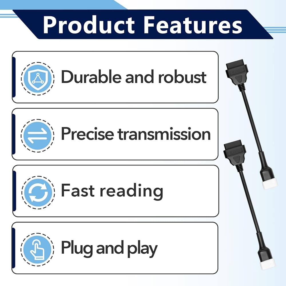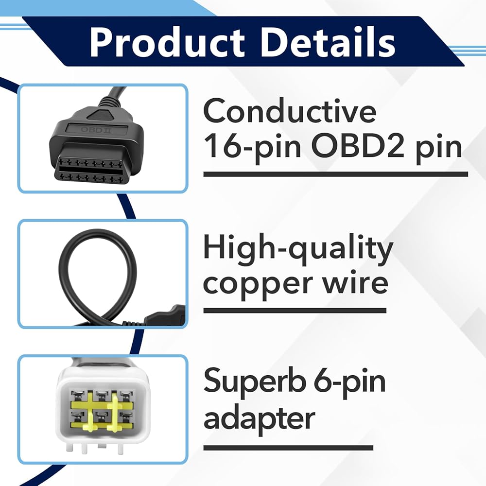 High-end Material: This cable of the motorcycle OBDII 6 pin to 16 pin OBD2 for Delphi is made with a copper core inside for excellent conductivity, and it is not easy to break for a long service life. This OBDII 6 pin to 16 pin OBD2 diagnostic adapter has a fast information transmission, accurately find the fault and quickly diagnose the problem.