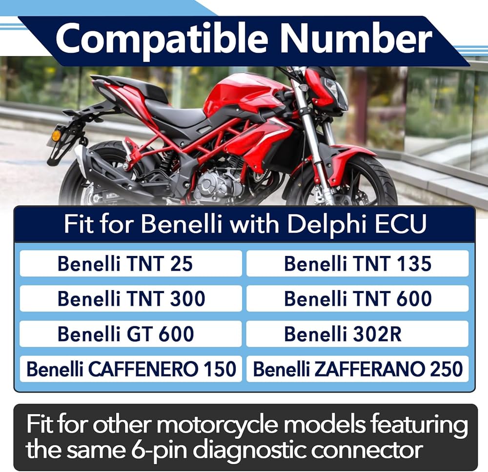 Applicable Models: This 6 pin to 16 pin OBD2 diagnostic adapter is compatible with Benelli with Delphi ECUs including Benelli TNT 25, Benelli TNT 135, Benelli TNT 300, Benelli TNT 600, Benelli GT 600, Benelli 302R, Benelli CAFFENERO 150, Benelli ZAFFERANO 250. This 6 pin to 16 pin OBD2 diagnostic cable is also compatible with other motorcycles with the same 6-pin connector.