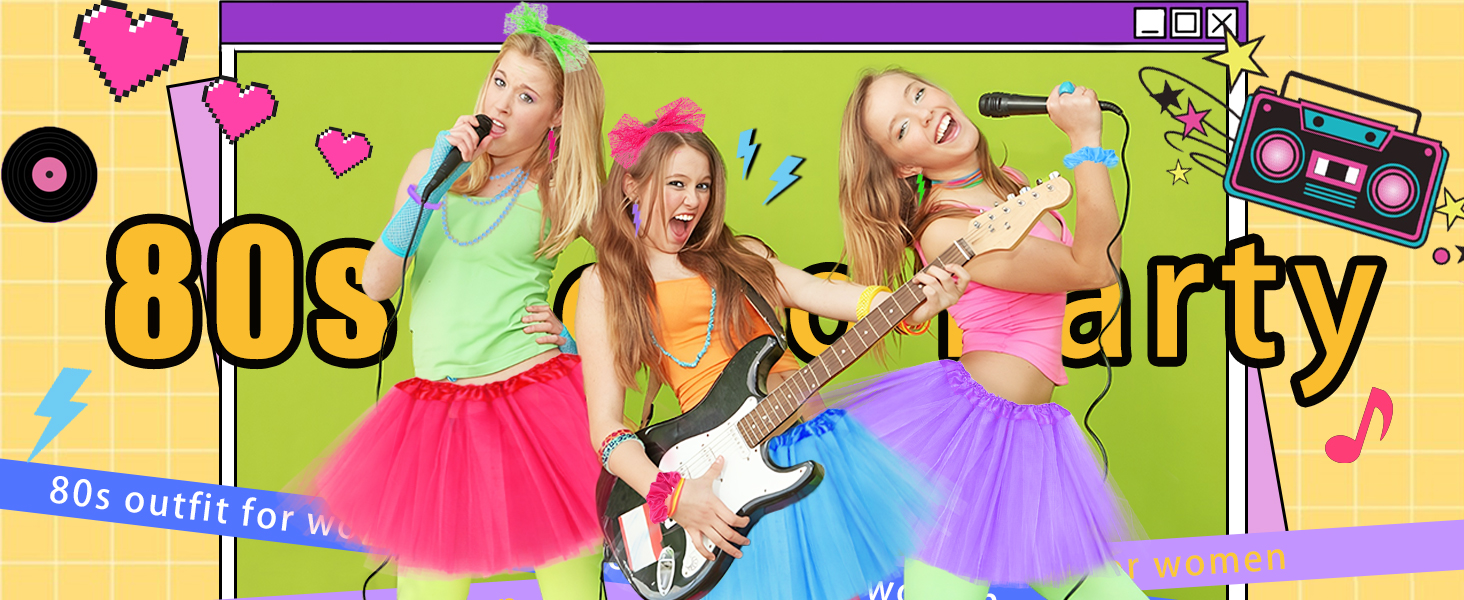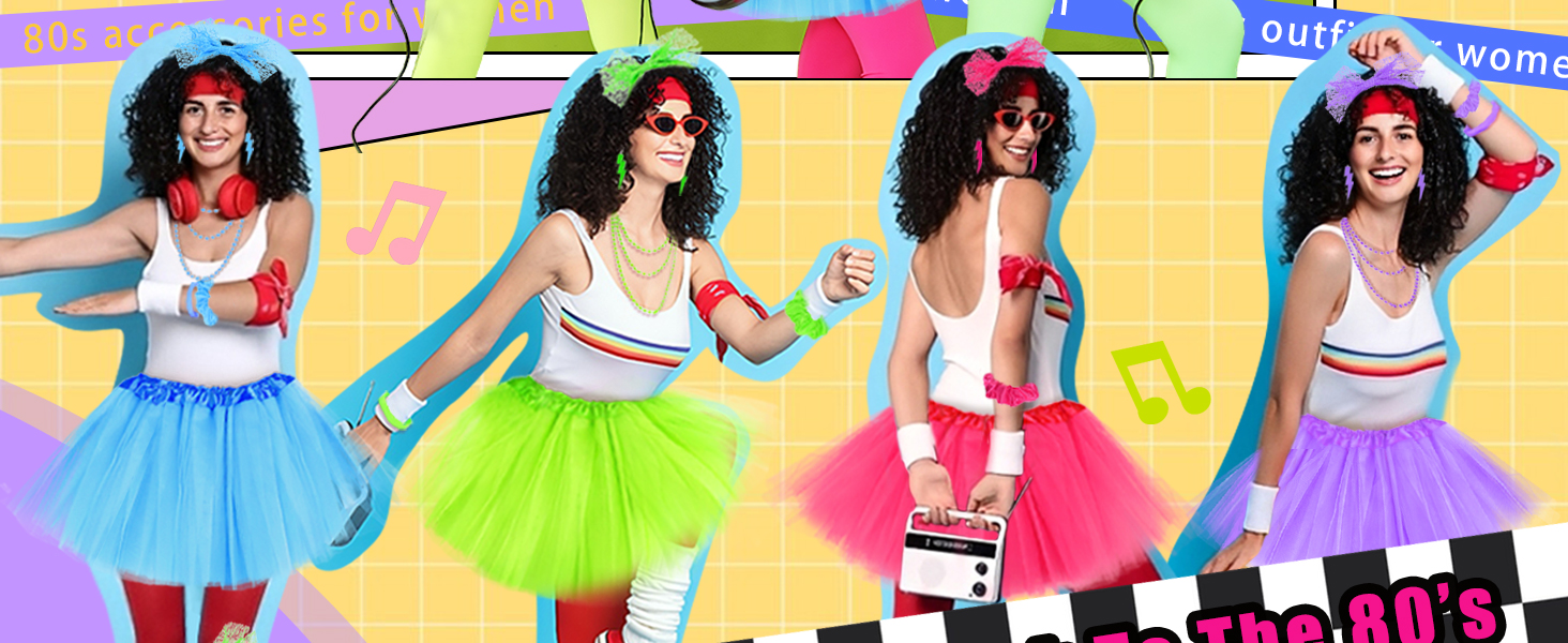 【FULL 80S ACCESSORIES FOR WOMEN SET】This rich 80s outfit for women includes 4 × 80s silicone bracelet, 4 × lightning 80s earrings, 4 × tutu skirt, 4 × neon scrunchies, 4 × bow neon headband, 4 × neon necklaces. Meet your 80 s outfits for women needs