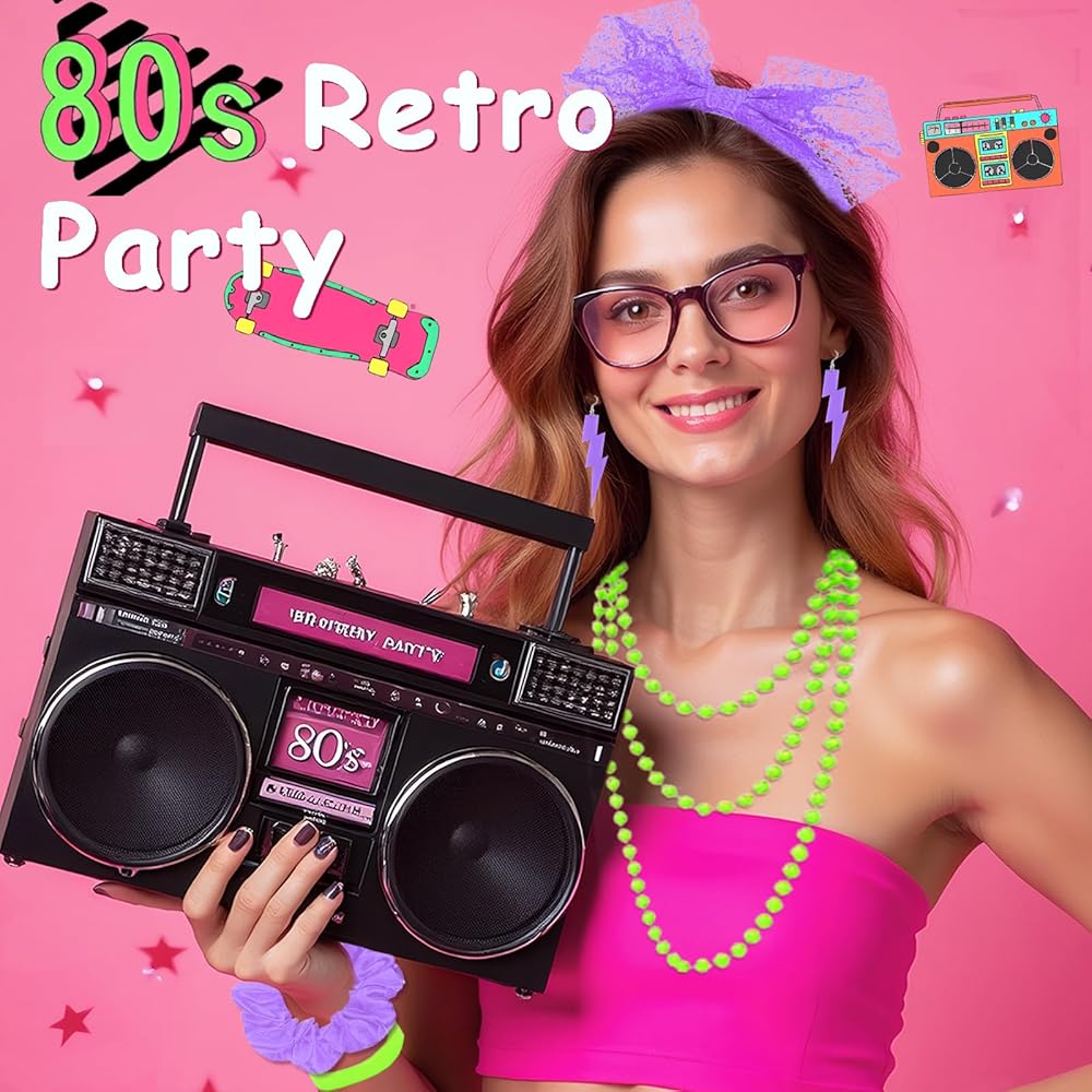 【SHARE HAPPINESS】There are a sufficient number of 80 s accessories for women in various neon colors, such as neon green, hot pink, purple and blue. You can wear these eye-catching 80s outfits with your family and friends. Have a happy retro party