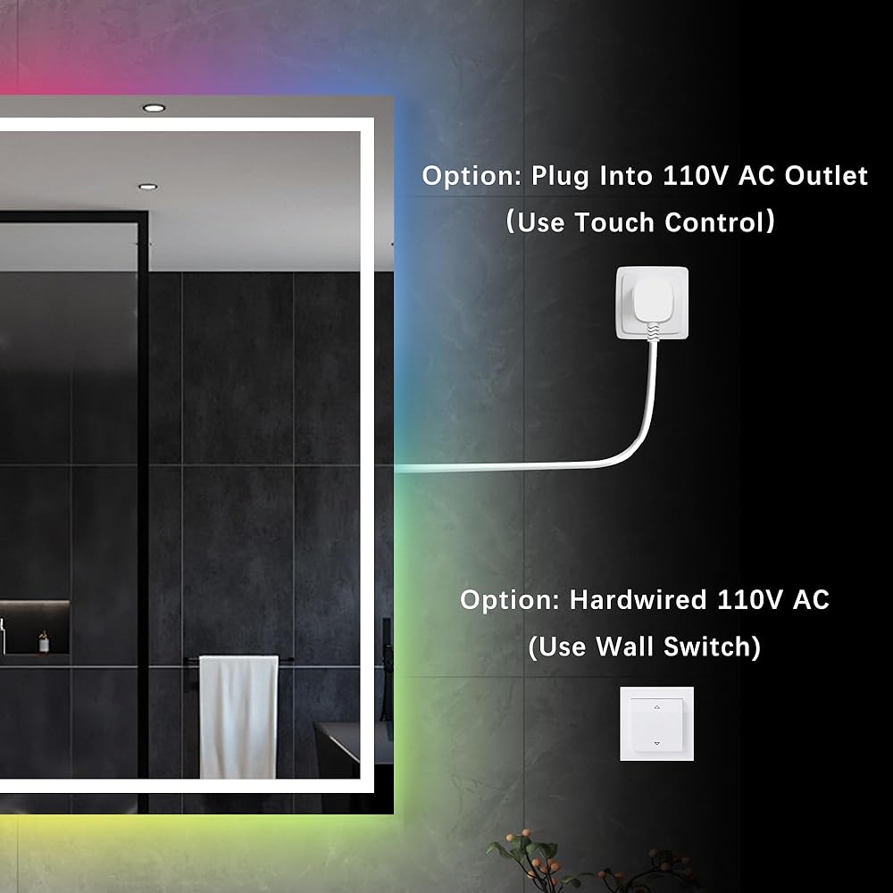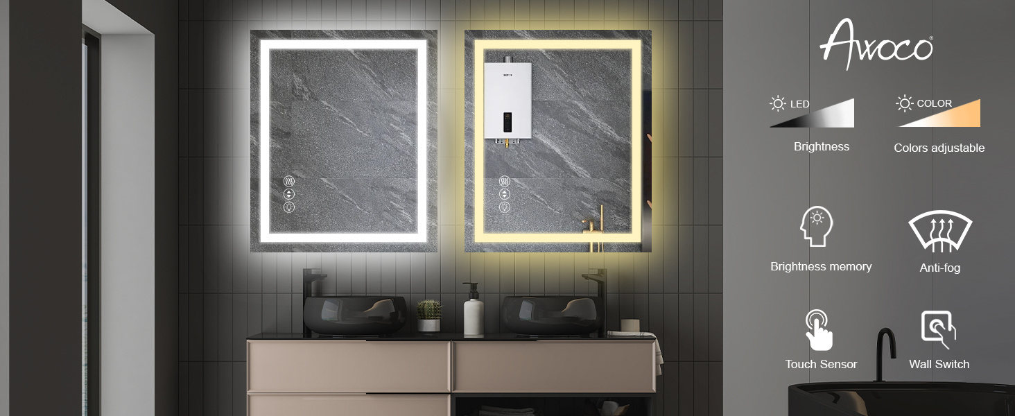 RGB Backlit & Front light: Awoco LED bathroom mirror provides front and back led strips, brighter than the mirror only with one strips. The RGB backlit has 8 light modes. With double lighting, this mirror is bright and clear enough for makeup, shaving and skin care, which also provides various light colors to meet your mood.