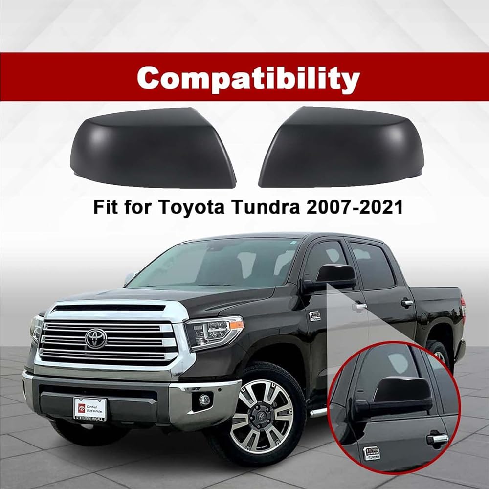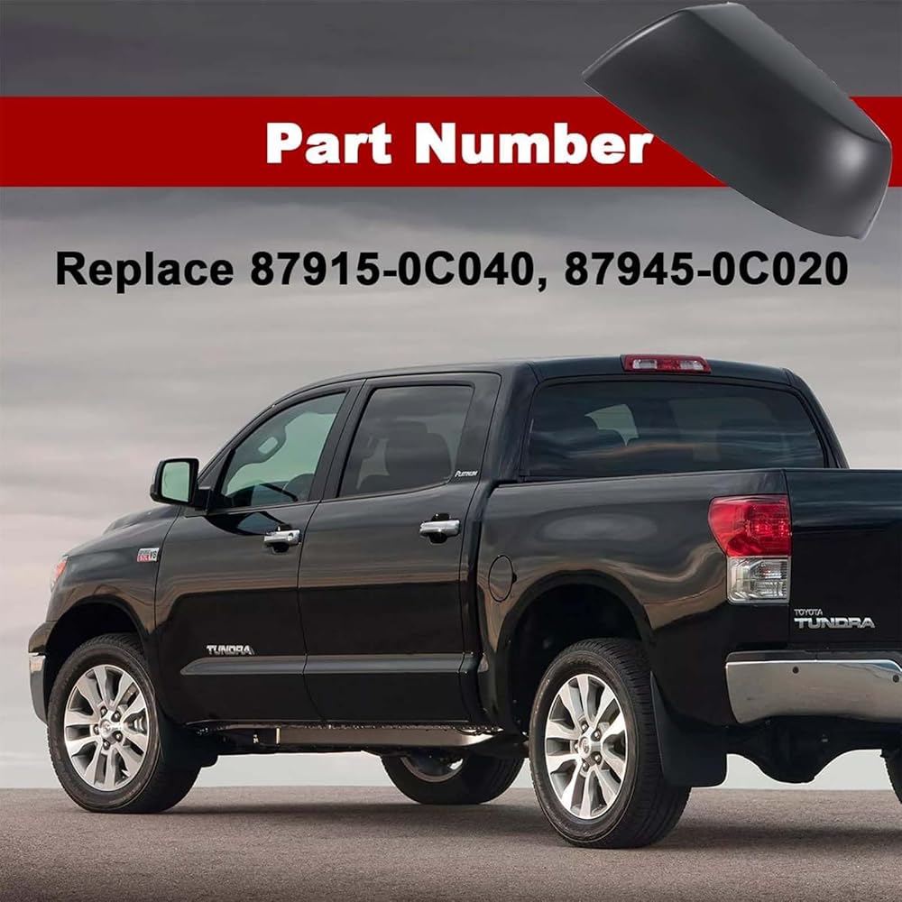 Compatibility: Fits Toyota Tundra (2007-2021), Sequoia (2007-2021) Part Number: 879150C040, 879450C020 Material: ABS Plastic Color: Textured Black Type: Mirror Cover Placement: Front Left, Front Right Note: This cap is a replacement part, not a stick-on type. It will not fit models with tow mirrors. Package Content: 1 Pair of Rear View Mirror Covers