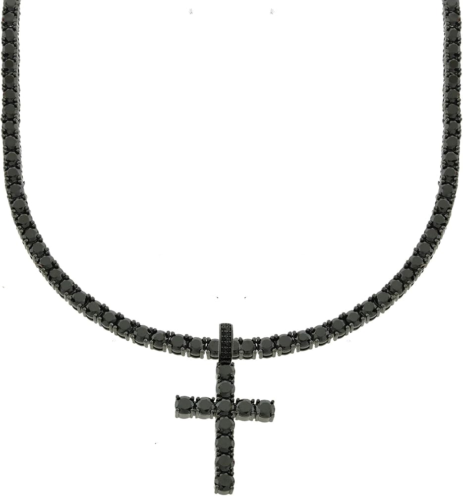 Men's Rhodium-Plated Silver Finish 14K Gold Finish Black Rose Gold 4mm Round Cut Cubic Zirconia Cross Pendant with 1 Row Tennis Necklace Choker Chain at manufacturers price. The 4mm 4 prong stone setting is basket and looks very classy. Makes it a top fashion accessory to complement your wardrobe with the sleek, contemporary styling offered by Bling Bling NY jewelry. This makes a wonderful gift for spouse or lover. Excellent birthday gift, anniversary present, fathers day gift, Christmas or holiday gift. Please feel free to ask me any question. Thank you for looking. Great quality at an amazing price.