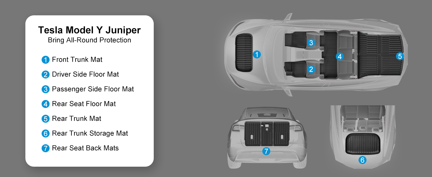 √ Full 13-piece set includes:1x Driver Side Mat, 1x Passenger Side Mat, 1x Rear Seat Mat, 1x Front Trunk Mat, 1x Rear Trunk Mat, 1x Rear Trunk Storage Mat, 3x Second Row Seat Back Mats, 1x Cup Holder Insert, 1x Center Console Organizer Tray, 1x Hidden Storage Box, 1x Armrest Console Organizer