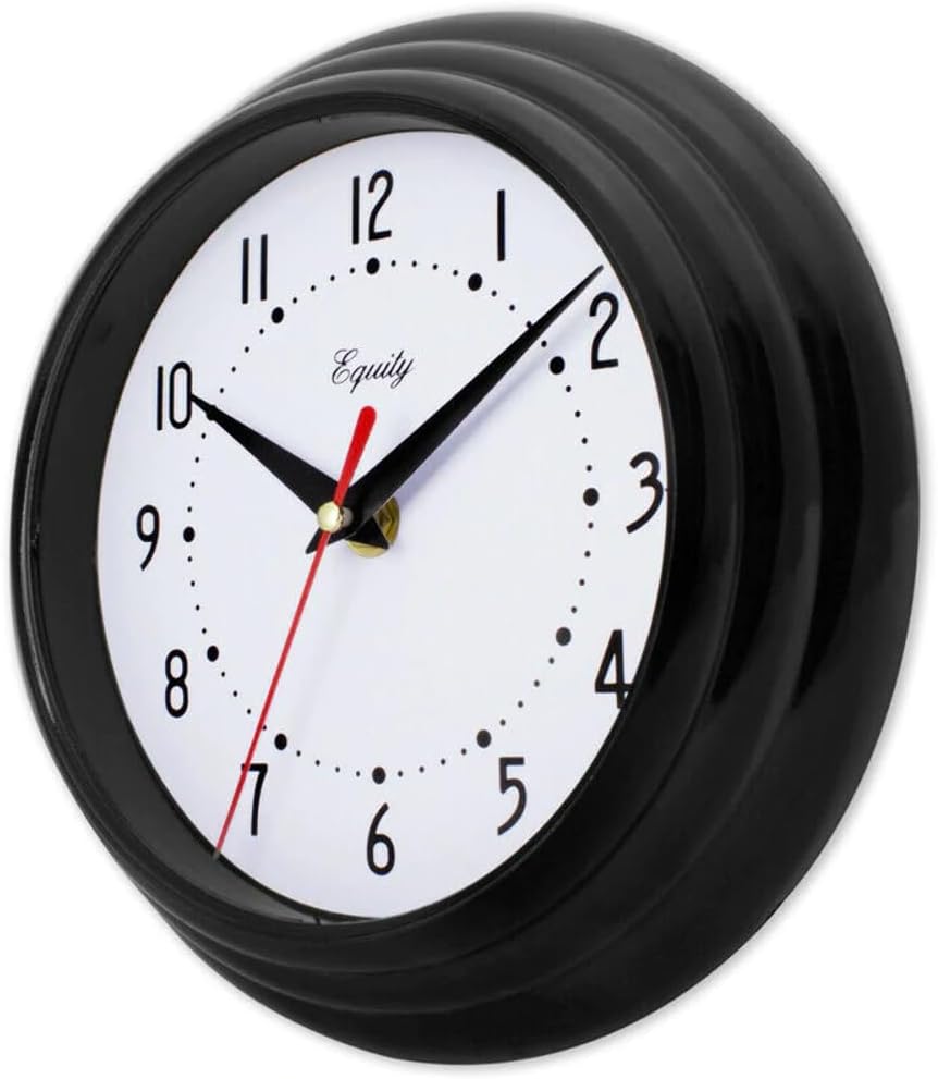 Elevate your home's style and functionality with the Equity by La Crosse 8-Inch Black Quartz Analog Clock. This wall-mounted timepiece blends modern aesthetics with classic timekeeping, perfect for any room in your house. Featuring reliable quartz movement, this clock ensures accurate timekeeping without frequent adjustments. The battery-powered mechanism offers hassle-free operation with a soft, unobtrusive ticking sound, ideal for quiet environments. The clock face boasts excellent visibility with bold black numerals on a crisp white background, allowing easy time-checking from across the room. Metal hands in black and red enhance readability and add sophistication. Built to last, the clock features a durable recycled plastic case in sleek black, demonstrating both style and sustainability. A protective glass lens shields the face, ensuring long-lasting clarity. Installation is simple with included mounting hardware. Operating on a single AA battery (not included), this 8-inch diameter clock offers flexible placement without cords or outlets. The Equity by La Crosse 8-Inch Black Quartz Analog Clock is more than a timepiece; it's a functional decor piece that enhances your home's ambiance. Its clean, timeless design complements various interior styles, making it perfect for any space or as a thoughtful gift.