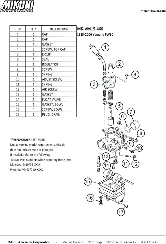 Genuine Mikuni Carburetor Rebuild Kits contain an assortment of critical parts which may include gaskets, diaphragms, seals, hardware and more.