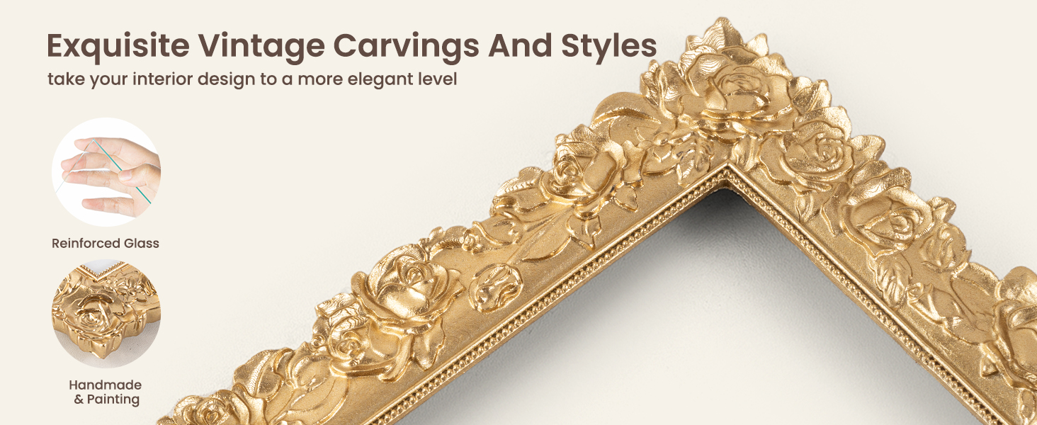 Artistic Vintage Sculpture -Transform your space with our luxurious picture frames, featuring exquisite retro flower carvings that embody timeless elegance. Each frame is carefully hand-brushed in a stunning gold finish, perfectly designed to showcase your cherished older photos while adding a touch of old-world charm