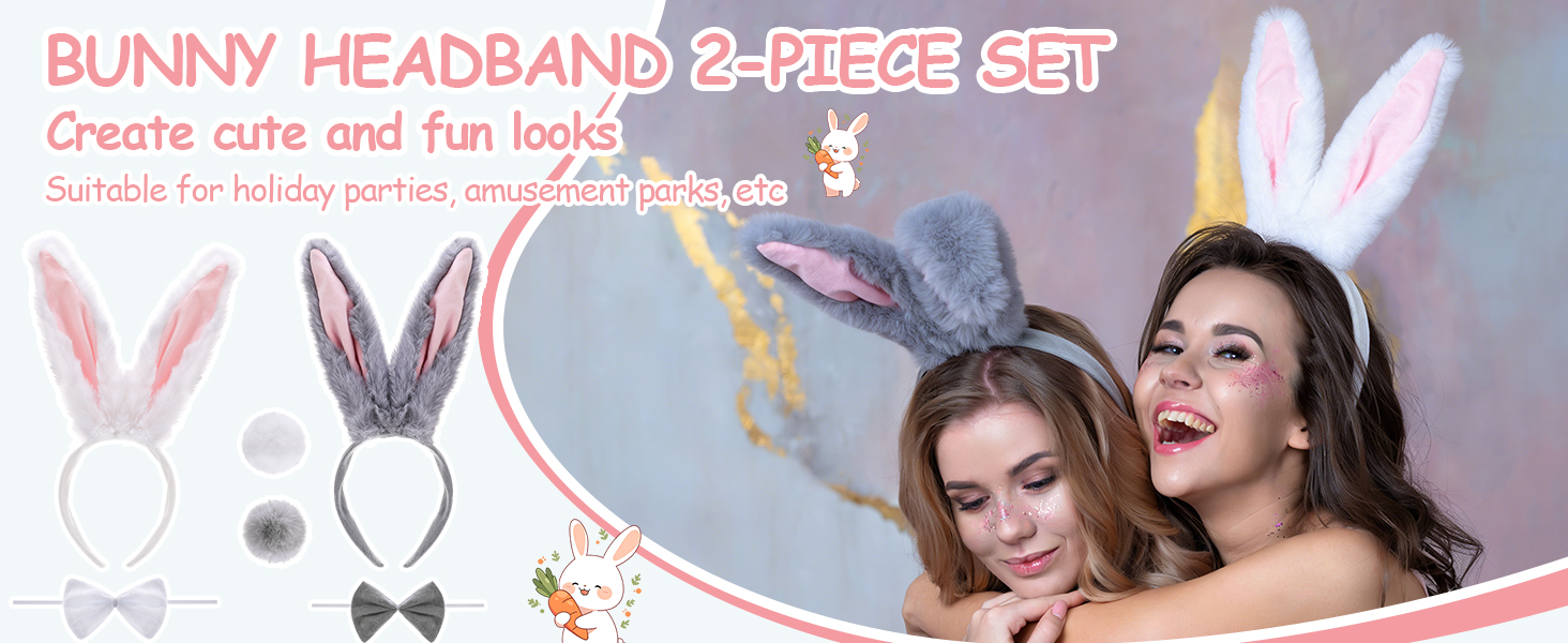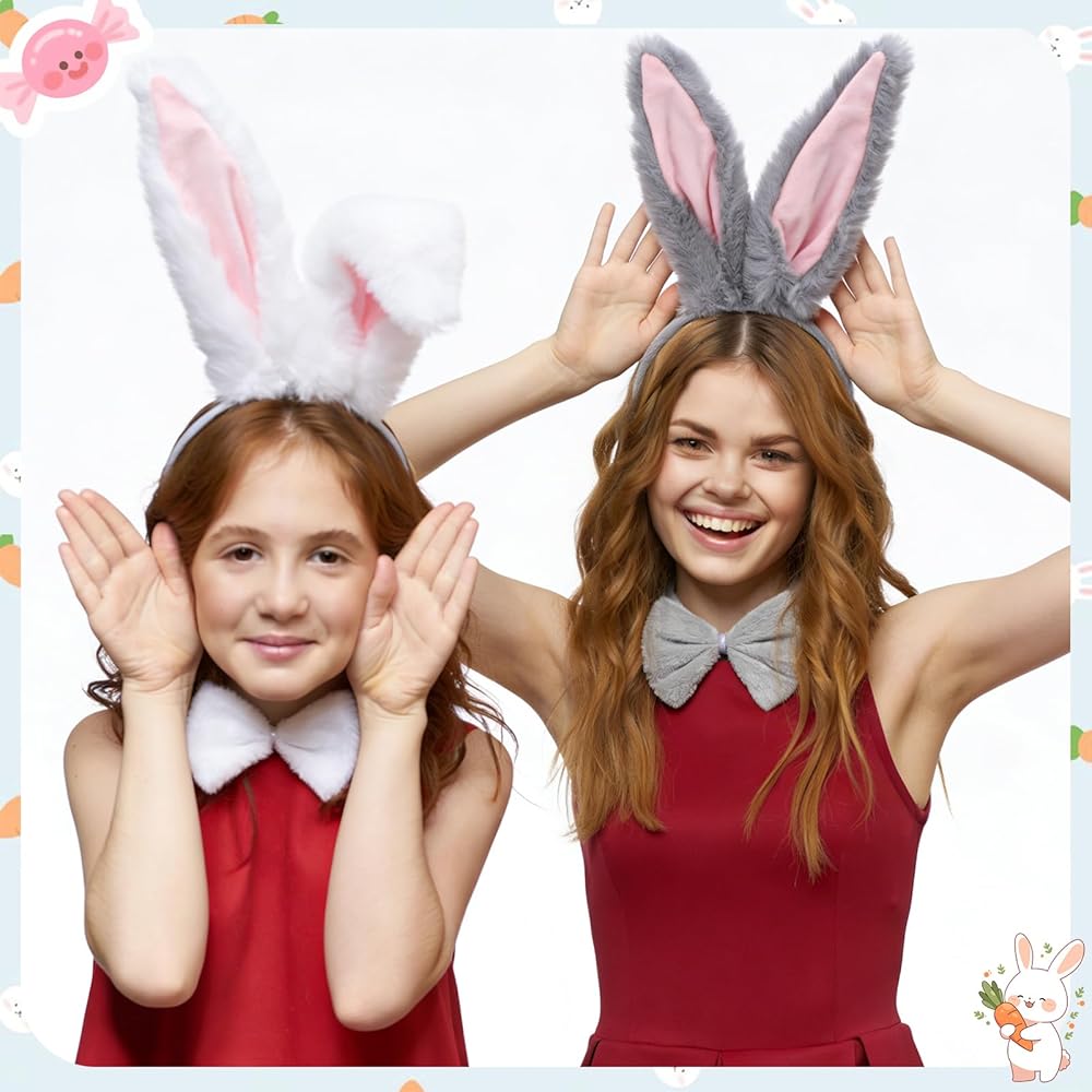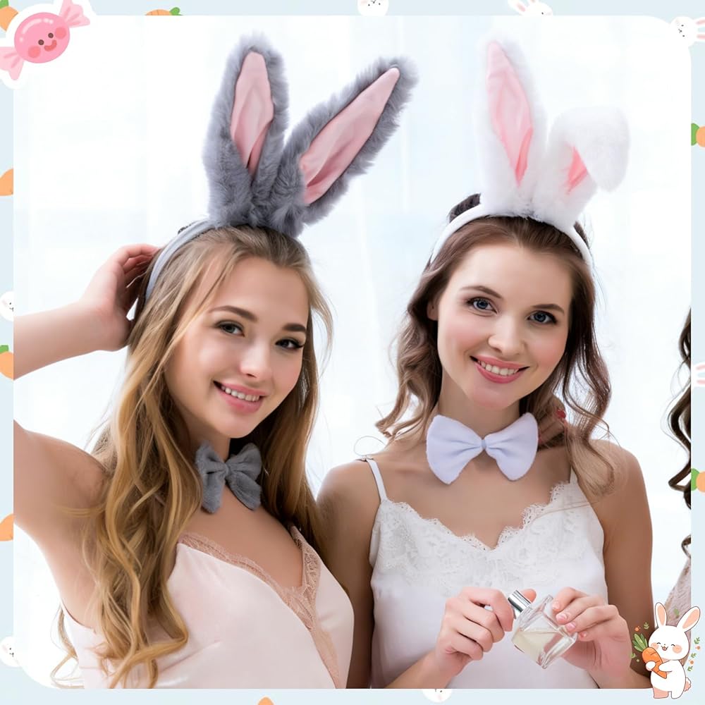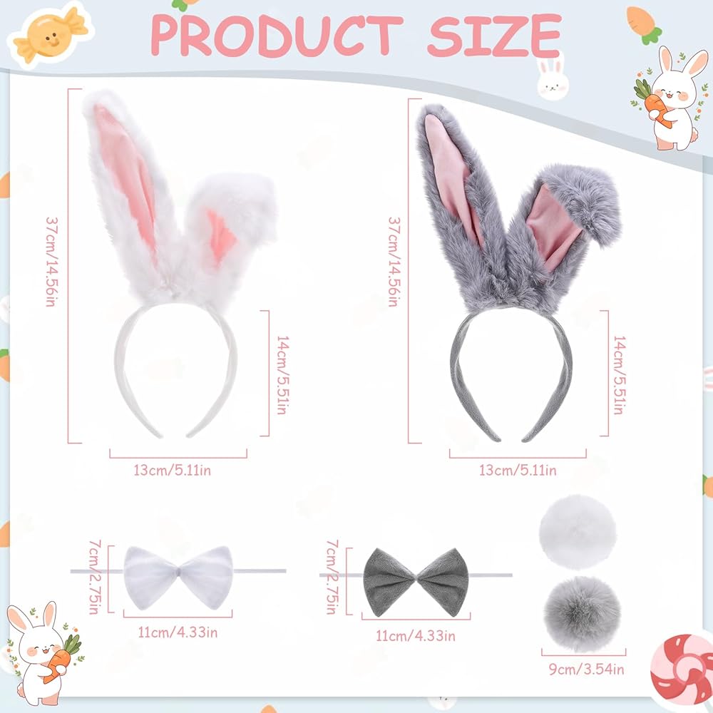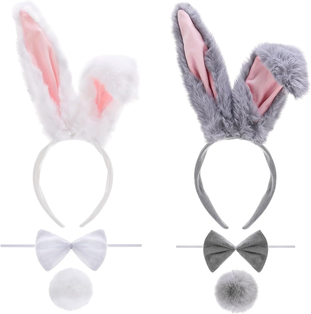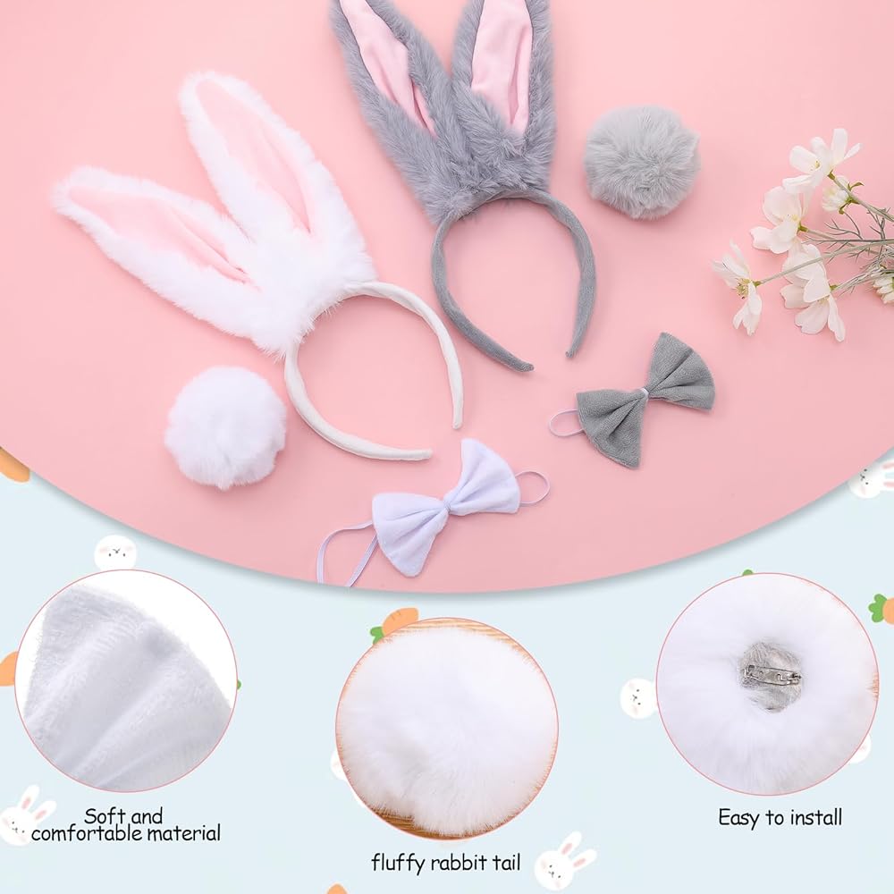 Set: This easter bunny costume is a two-tone bunny ear themed accessory set, available in gray and white. It includes two long ear headbands, two bows, and two bunny tails. The two-tone design caters to different styling needs, allowing for multiple looks with just one set, suitable for individual or duo outfits