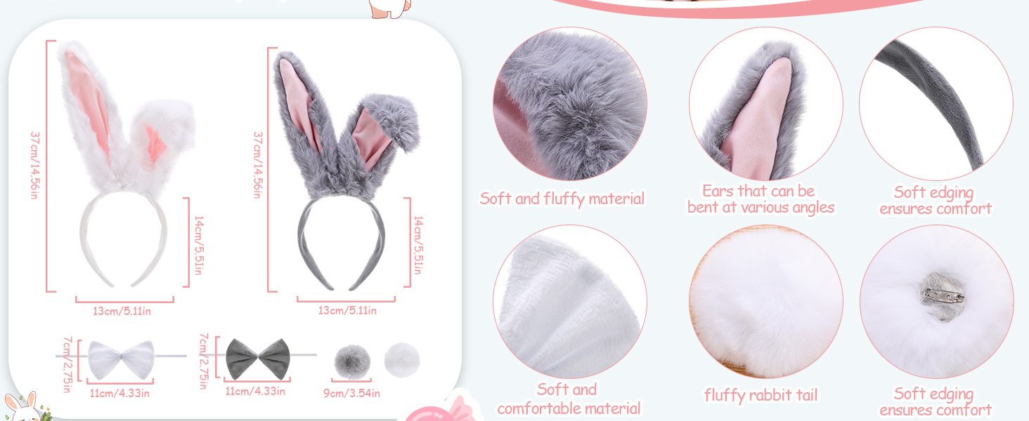 Design: The bunny ear headbands have built-in flexible metal wires that allow for free bending and shaping, adjusting the curvature and height of the ears to your liking. Combined with sturdy pin-style bunny tails and highly elastic bows, they are easy to wear and secure, preventing them from falling off during activities