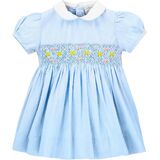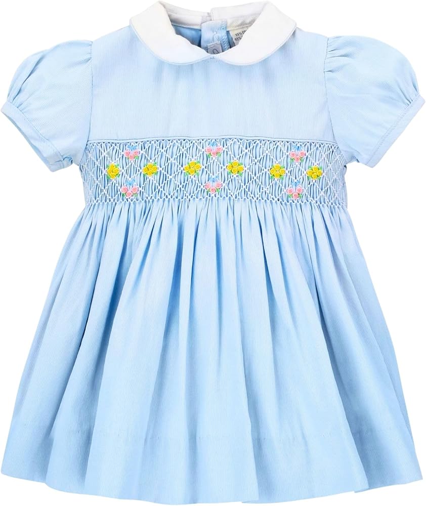 This is a super elegant and beautiful yoke dress which will make a statement whereever she goes. There is a hand smocked waist with flowers and a contrasting white peter pan collar. Great for weddings, occassions, Holidays or weddings. Great item!