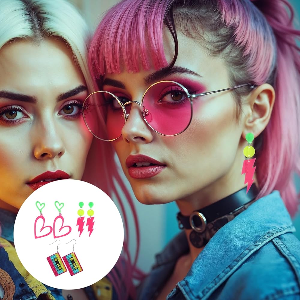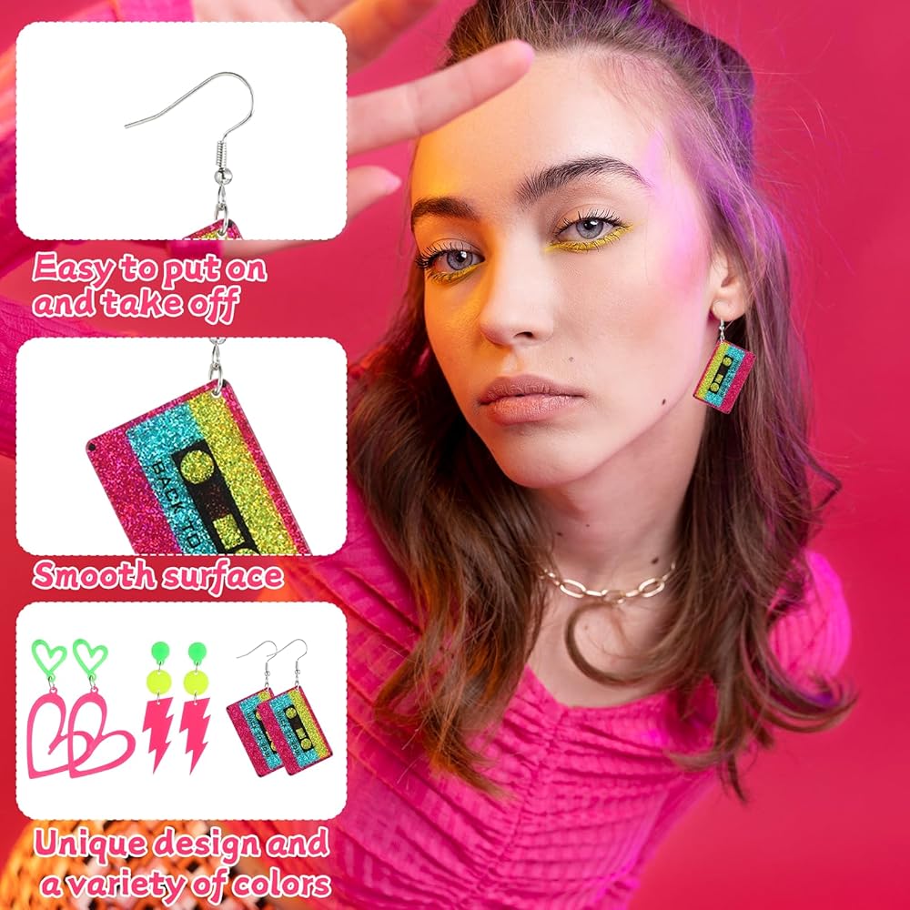 Step into the spotlight with this stunning pair of retro 80s earrings for women—where neon brilliance meets iconic '80s and '90s vibes. Crafted for lovers of vintage 80s jewelry, these drop & dangle earrings blend high-impact neon hues with playful movement, making them the ultimate accessory for themed parties, cosplay, or adding retro flair to modern looks.