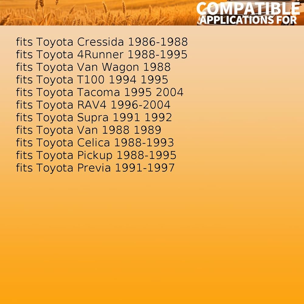 Fitment: Transfer Case Output Shaft Seal fits Toyota 4Runner 1988-1995 fits Toyota Celica 1988-1993 fits Toyota Cressida 1986-1988 fits Toyota Pickup 1988-1995 fits Toyota Previa 1991-1997 fits Toyota RAV4 1996-2004 fits Toyota Supra 1991-1992 fits Toyota T100 1994-1995 fits Toyota Tacoma 1995-2004 fits Toyota Van 1988-1989 fits Toyota Van Wagon 1988