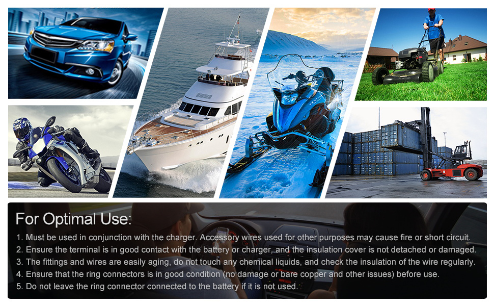 Wide Range of Application: This is the best way to keep a battery charged on a Motorcycle,Boat,Cycle,Bike, Car,Tractor,Riding Mower, ATV, every vehicle outdoor equipment.