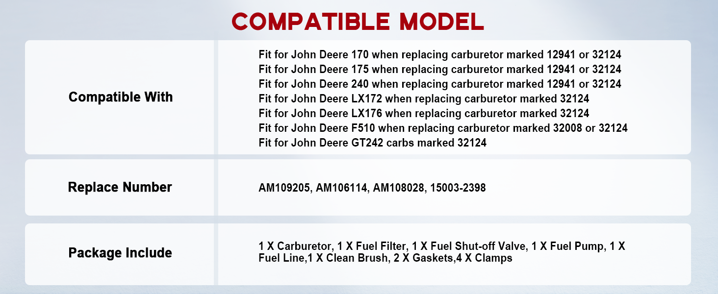 【Fitment】For John Deere GT242 GT262 GT275,028505+,LX175,LX240,F510,F525,LX172,LX176,GT242 carbs marked 32124,Commercial Walk Behinds with 38 48 54 decks 12.5hp or 14hp engines