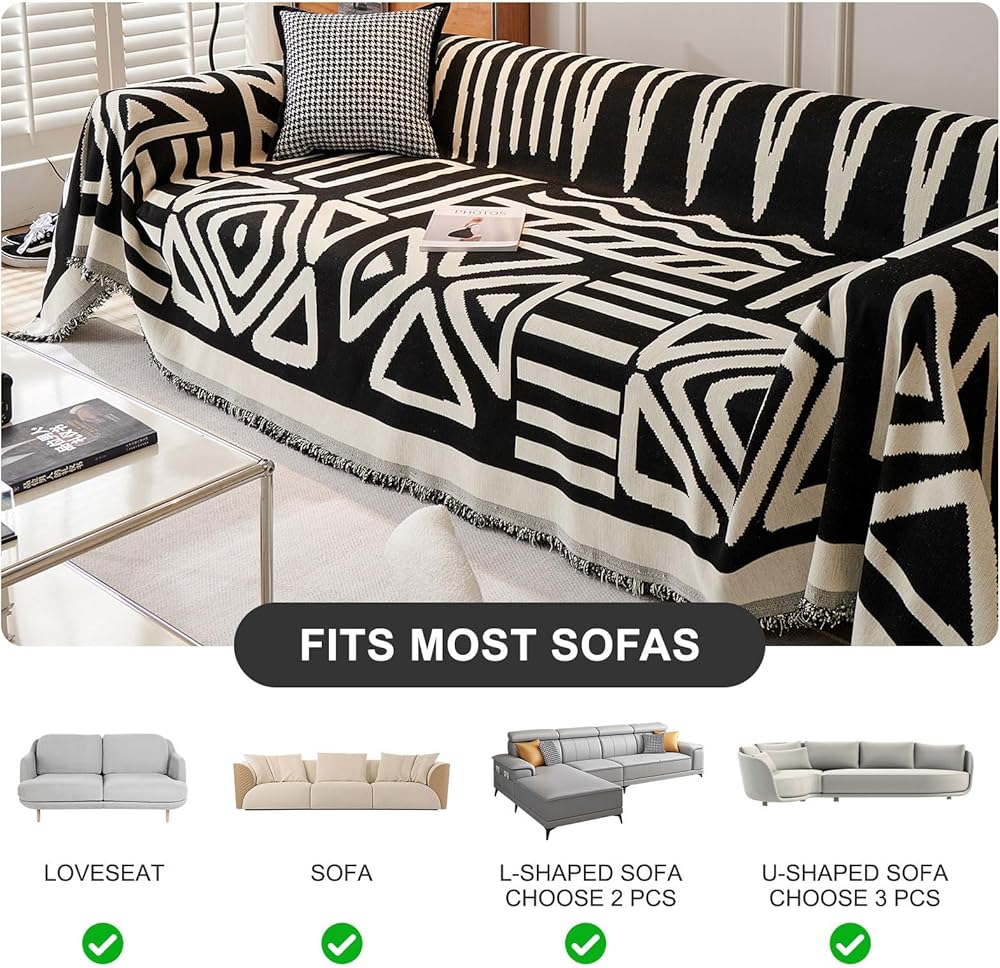 STACYPIK Modern Boho Sofa Cover for Dogs Chenille Couch Cover with Tassels Reversible Anti Slip Sofa Slipcover for 3 Cushion Couch Soft Black Beige L Shaped Cover Multi-Use Throw Blankets-71X134IN