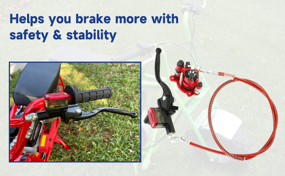 Durable and Sturdy: Our hydraulic disc brake caliper and disc rotor use premium metal materials, providing wear and scratch resistance and lasting throughout the mini bike's usage time. The hydraulic brake hose is made of premium synthetic rubber, with excellent flexibility and pressure resistance