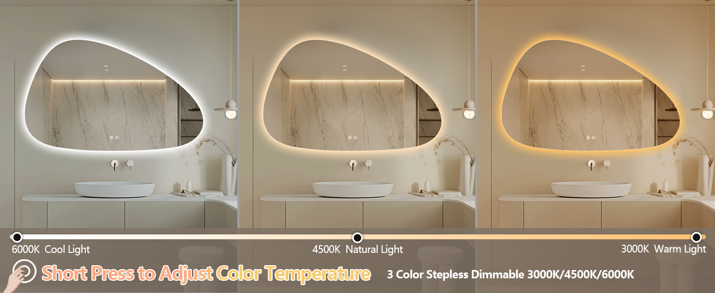 【3 ألوان وقابلة للتعتيم】: التبديل الحر بنقرة واحدة بين الضوء الدافئ (3000 كلفن)، والضوء الطبيعي (4500 كلفن)، والضوء الأبيض البارد (6000 كلفن)، مما يتوافق بسهولة مع سيناريوهات مختلفة مثل المكياج أو العناية بالبشرة أو الحلاقة. تدعم كل درجة حرارة لون التعتيم المستمر بنسبة 10% - 100%، مع ضوء ناعم في الليل غير مبهر، وضوء ساطع كامل في الصباح ينشط الروح. وظيفة ذاكرة مرآة الحمام الذكية أوتوماتيكية أيضًا