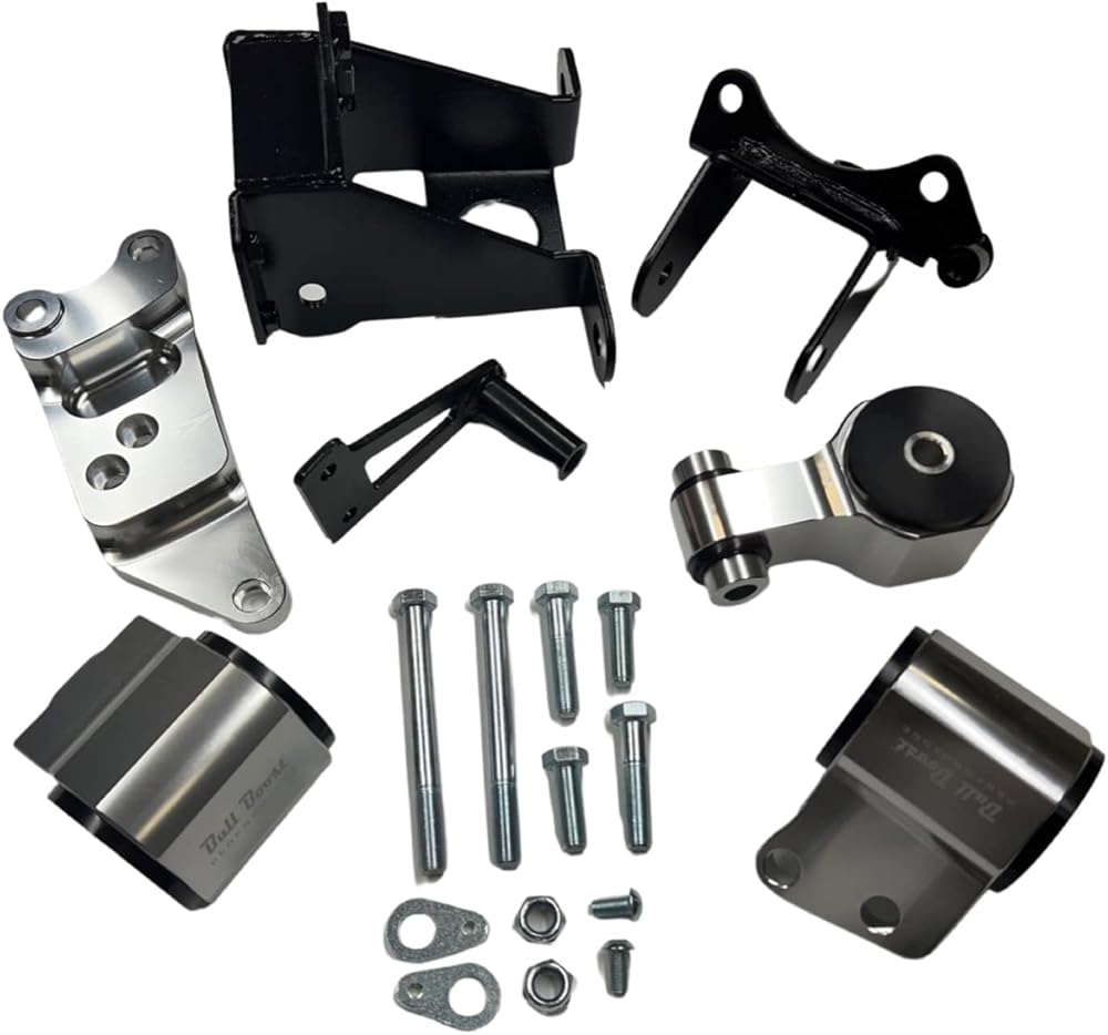 Our engine mount kit is designed to produce crisper gear shifts by preventing the front end of the engine from pitching up or down, forward or back. The mounts further improves traction and reduces wheel hop. All engine mounts are made of high grade billet aluminum material, urethane bushings and steel pins. This mount kit is a direct replacement of the OEM mounts especially the liquid filled engine mount, which tends to fail even on completely stock cars.