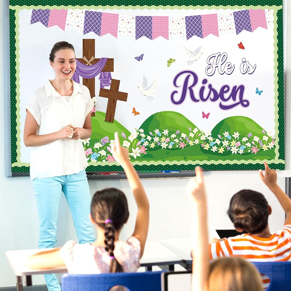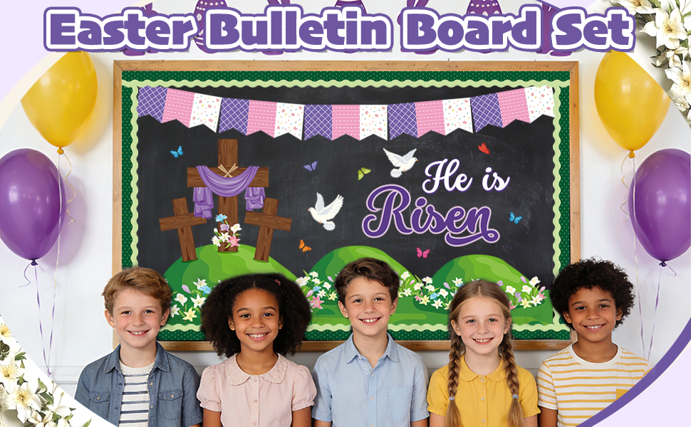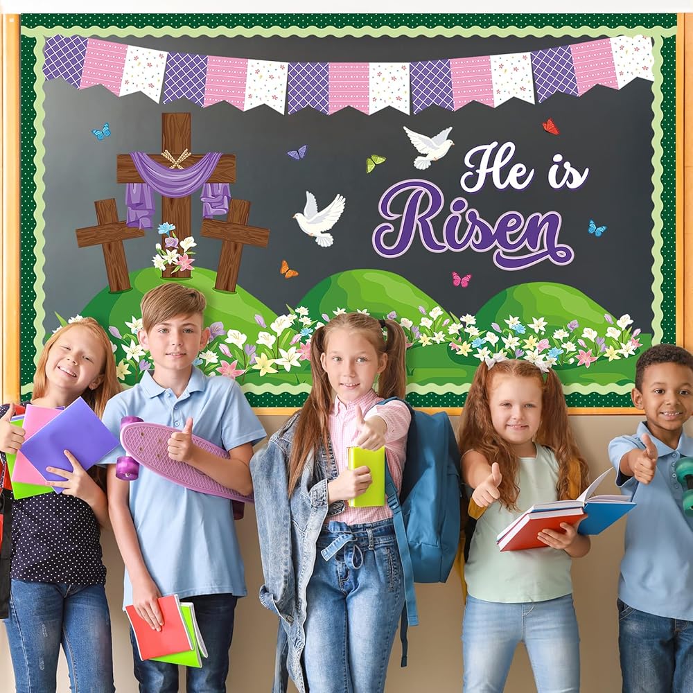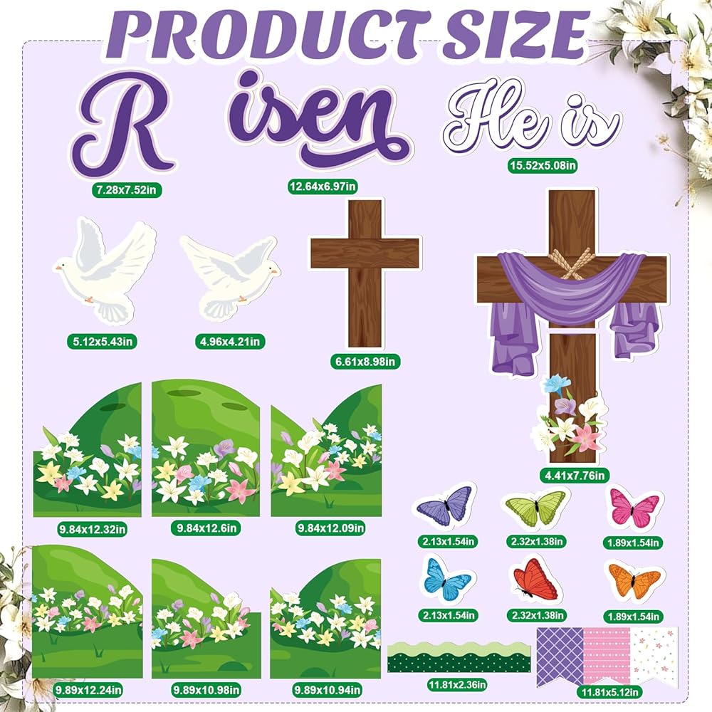 Package Includes: You will receive a Easter bulletin board decorations set containing 1 pcs large cross cutouts, 2 pcs small crosses paper cut out, 8 pcs peace dove and butterfly decorative paper cards, a striking "He is Risen" slogan, 6 pcs blooming lily flower grass cutouts, 16 pcs bulletin board borders, 5 pcs Easter flags banner, and 80 glue dots. Creating a spring-filled world with this Easter backdrop set