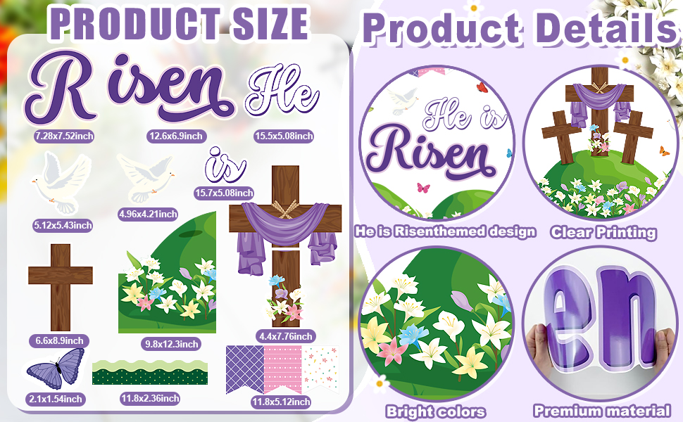 Premium Material: This He Is Risen Easter decor is made of premium paper, with clear printing, vibrant colors, precise cutting and a smooth surface, can be used for a long time. This eye-catching religious bulletin boards brings a positive atmosphere to your space and adds seasonal freshness and vitality to your Christian Easter decorations, creating a joyful and vibrant Easter display