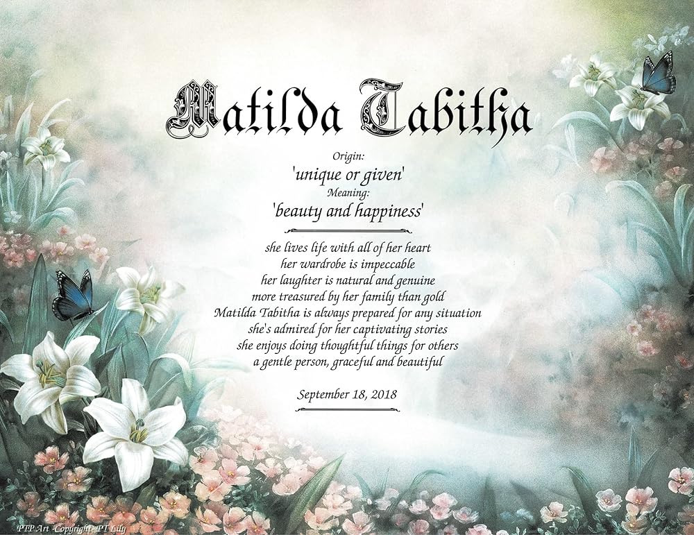 Beautiful Quality 8.5" x 11" print You Supply: First Name, Birth Date (optional), and up to 60 characters of text (e.g. Happy Birthday - Love Mom & Dad, etc) We supply: name orgin, name meaning, traits (including career, money, relationships, etc.) Perfect gift for Anniversary, Birthday, Mother's Day, Father's Day, New Baby, Christmas, and many other occasions!