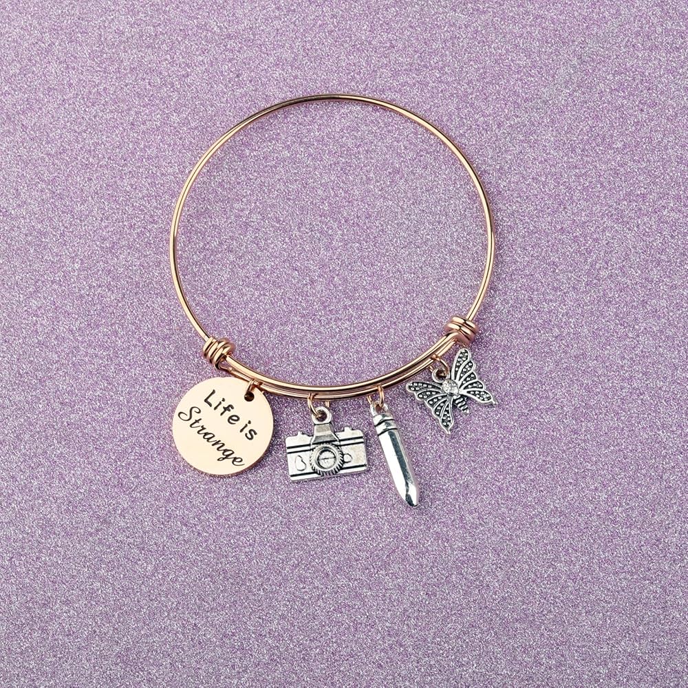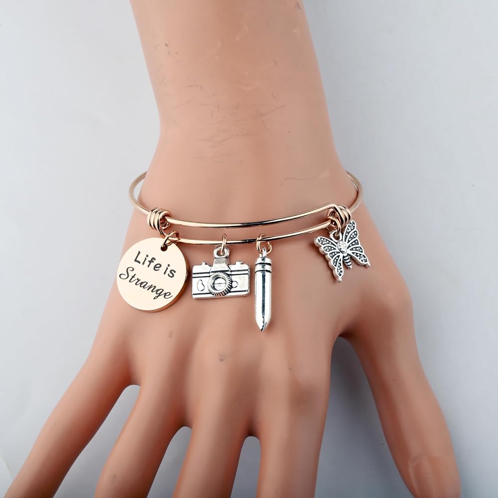 Life is Strange Inspired Gift - A camera charm, to represent Max, and a bullet charm, reminiscent of Chloe's Bracelet,and a butterfly charm to represent the game in general.