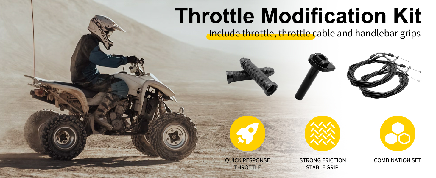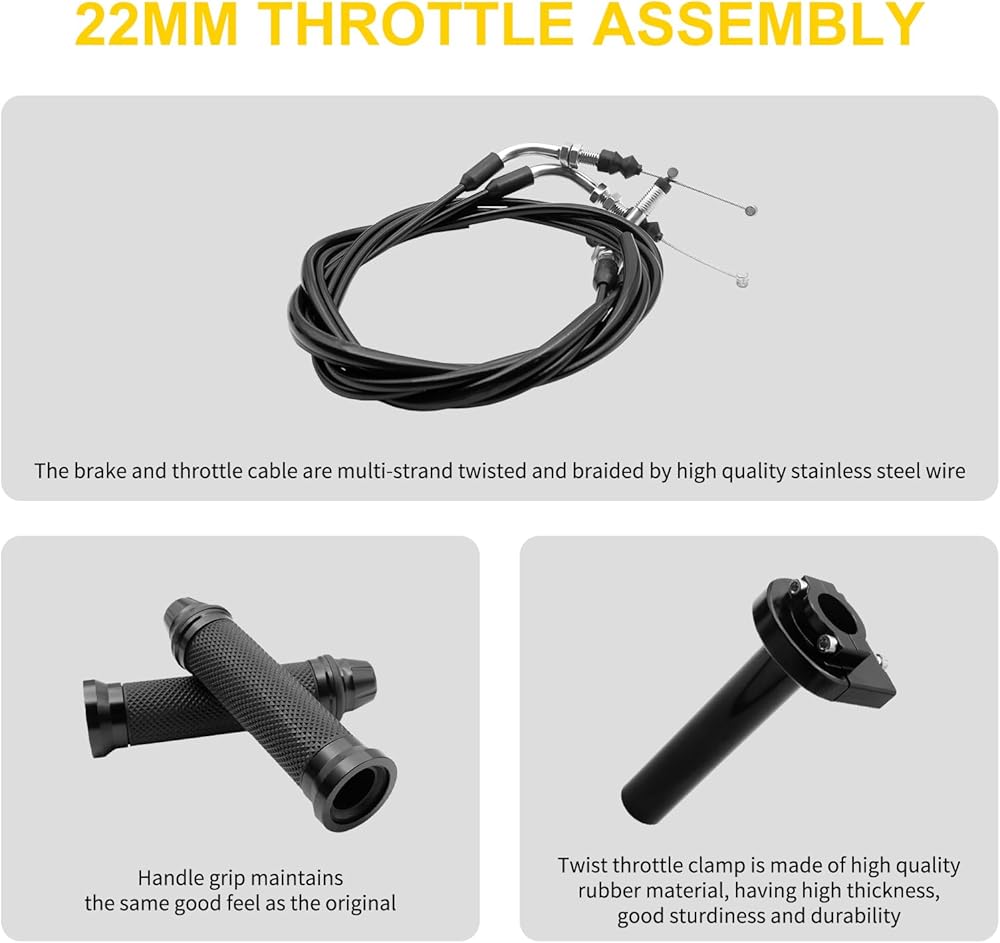Package Includes:One*Throttle Cable + One*Throttle Twist Grip +One*Handlebar Grip.(Note:optimized for 22mm handlebars, perfect for scooters and ATVs)
