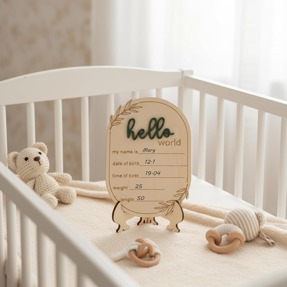 [Product Description] Wooden hello world sign features your baby's name, date and time of birth, height, and weight. Its beautiful design makes it both a decorative and practical tool for recording birth details