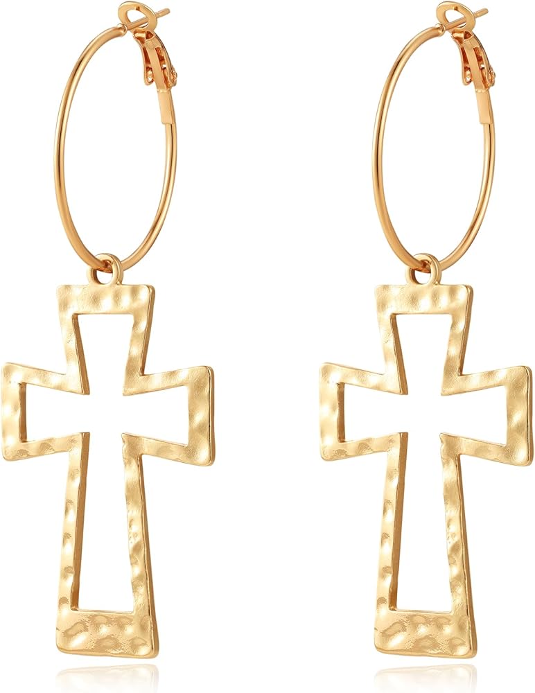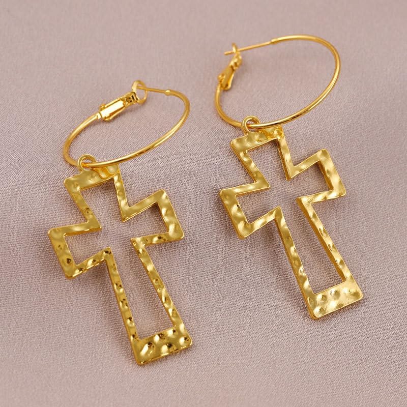 Make a bold statement with these eye-catching vintage-inspired cross earrings. The elegant design features lightweight gold-tone hoops that gracefully suspend open-worked cross pendants, creating a stunning drop dangle effect. These statement pieces combine classic religious symbolism with contemporary style, perfect for adding a touch of sophistication to any outfit. The hollow cross design ensures these earrings remain comfortable for all-day wear while maintaining their dramatic presence. The huggie-style hoops offer secure and comfortable attachment, making these versatile pieces suitable for both casual and dressy occasions. These timeless accessories measure approximately 2 inches in total length, striking the perfect balance between standout style and wearable elegance. The metallic finish catches light beautifully, adding sparkle and dimension to your jewelry collection. These versatile earrings pair wonderfully with both modern and vintage-inspired ensembles, making them a valuable addition to any fashion-forward wardrobe.