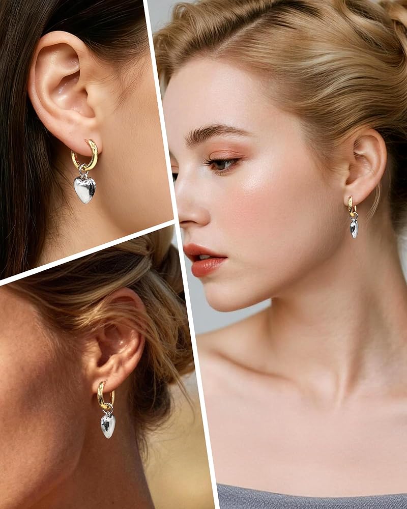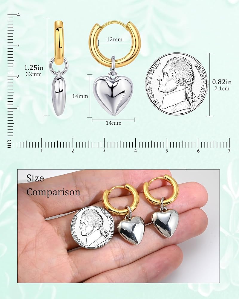 [Chunky Size] With a total length of 1.25in (32mm), a 12mm gold huggie hoop, and a 14mm silver heart pendant, these small dangle hoop earrings balance noticeable style and lightweight comfort. This perfectly sized design makes these heart earrings suitable for various ear shapes and hairstyles, without feeling bulky or heavy