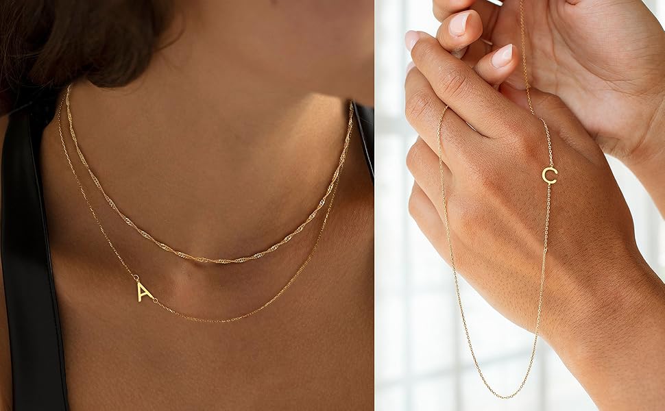 Layered Initial Necklaces Design:A double-layered letter necklace. The first layer is a wavy chain and the second layer is sideways initial necklace. You can wear it alone or stack it with other necklaces. this necklace allows you to customise your initial or the initial of someone special, making it the perfect keepsake or thoughtful gift.