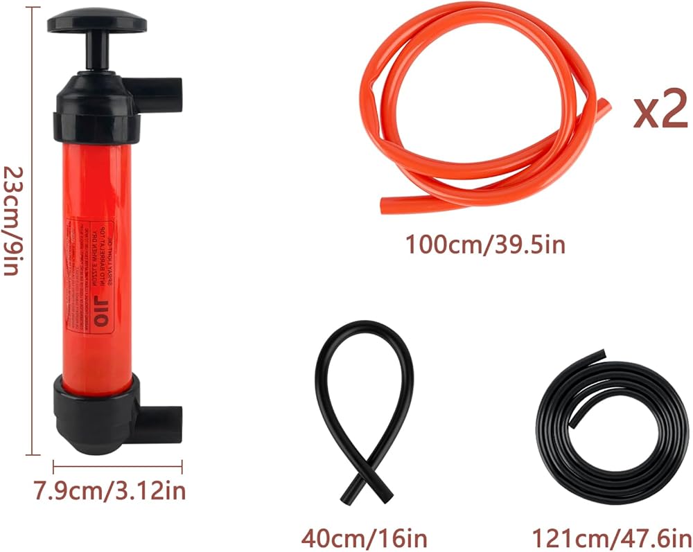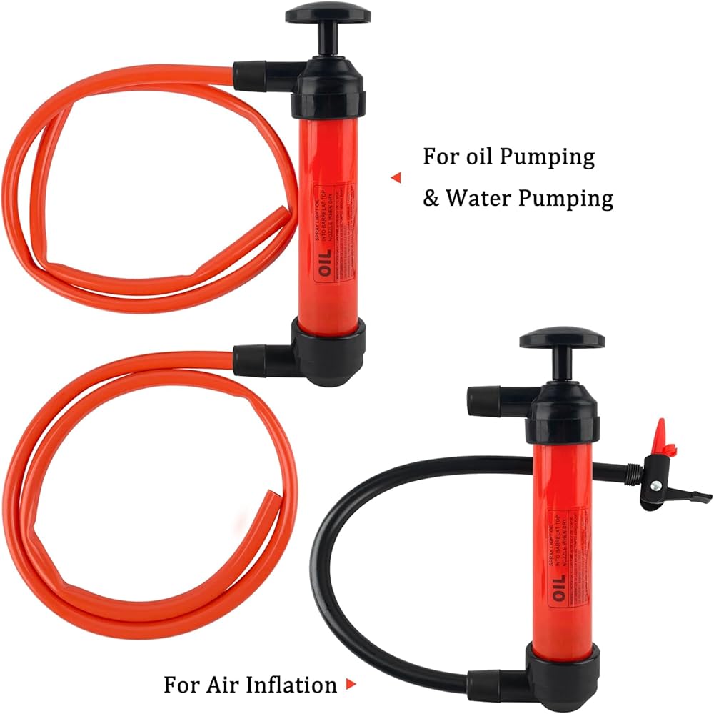Multi-functional siphon pump. Includes 9.05in barrel, 2x 39.37in red hoses, 7.63in black extension hose, 16in black hose. PVC, lightweight, leak-proof. Empties 3 gallons (12L) per minute. Transfers air, water, diesel, gasoline, kerosene. Easy to clean. With air adapter kit. For fuel tanks, oil pans, aquariums, buckets. Also inflates sports balls, kids' toys.