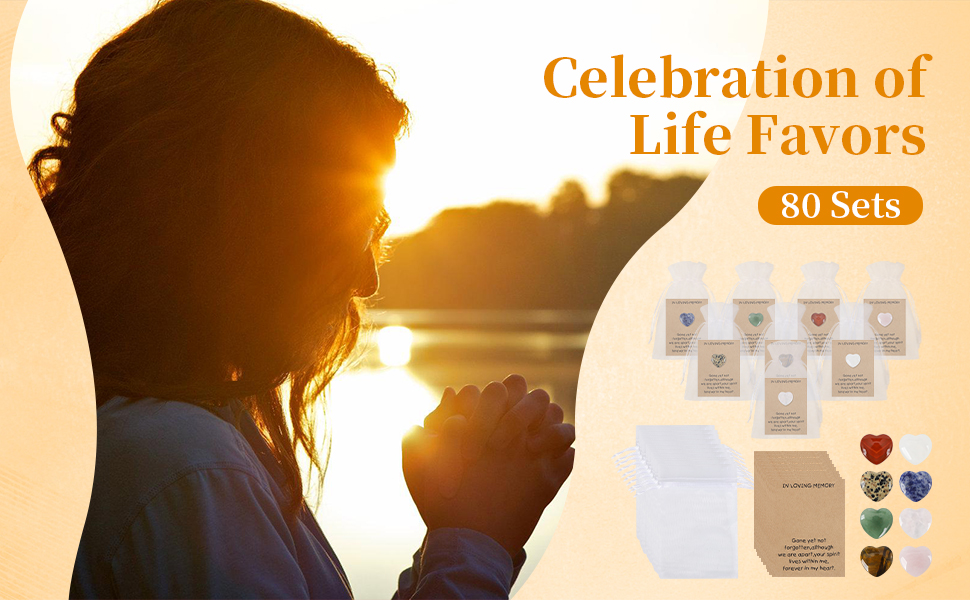 80 Sets of Celebration of Life Ideas: This celebration of life favors set includes 80 bulk pocket sized memorial cards, 80 heart shaped natural stones, 80 organza bags, and 80 glue dots perfect for expressing care and encouragement to friends with ample quantity and vibrant colors.