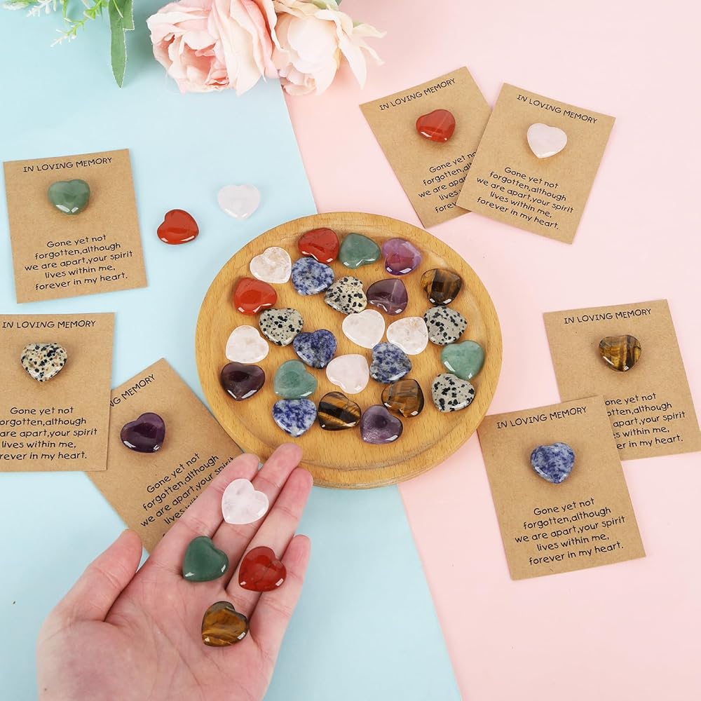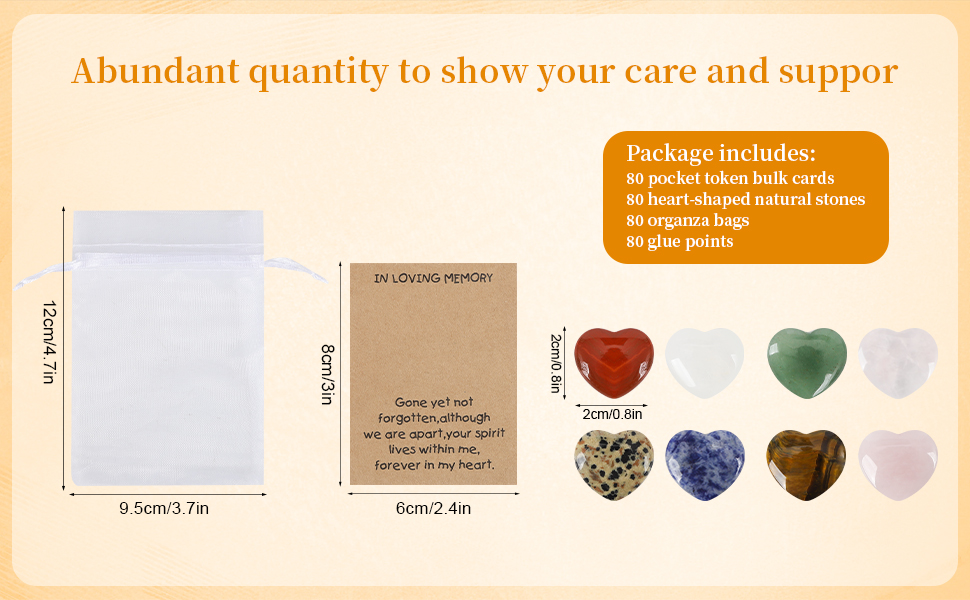 Celebration of Life Gifts Perfect Size: Each pocket token card measures about 2.36 x 3.15 inches (6 x 8 cm), ideal for carrying and storing. The heart-shaped stones measure approximately 0.79 x 0.79 x 0.24 inches and pair perfectly with the cards. The organza bags measure about 3.54 x 4.72 inches (9 x 12 cm), combining beauty and practicality.