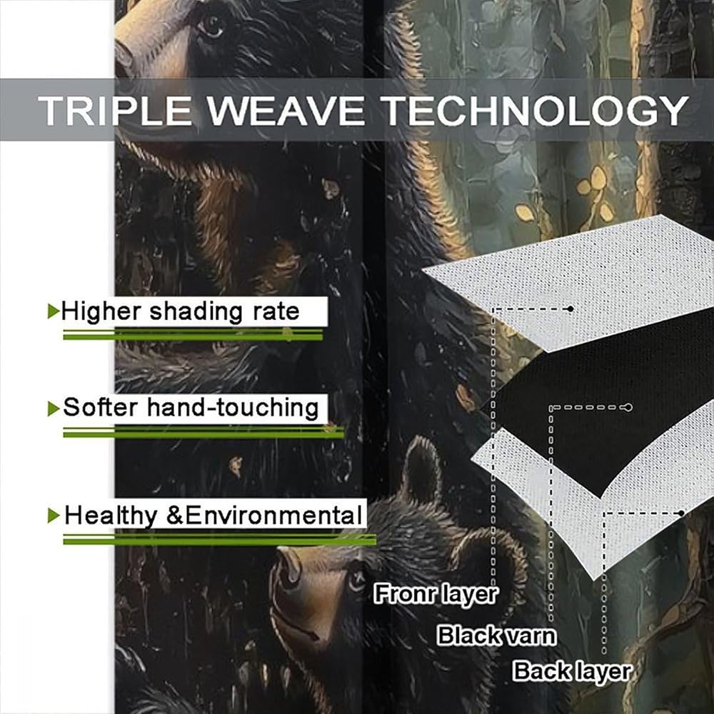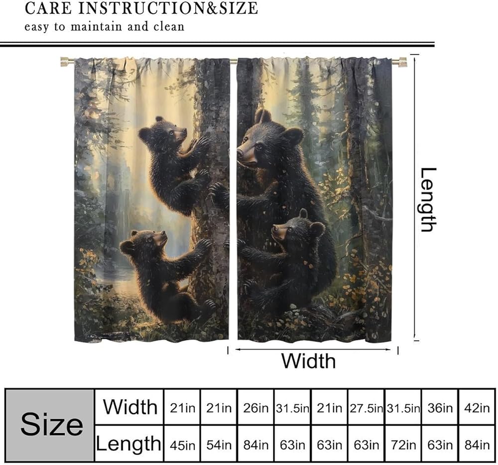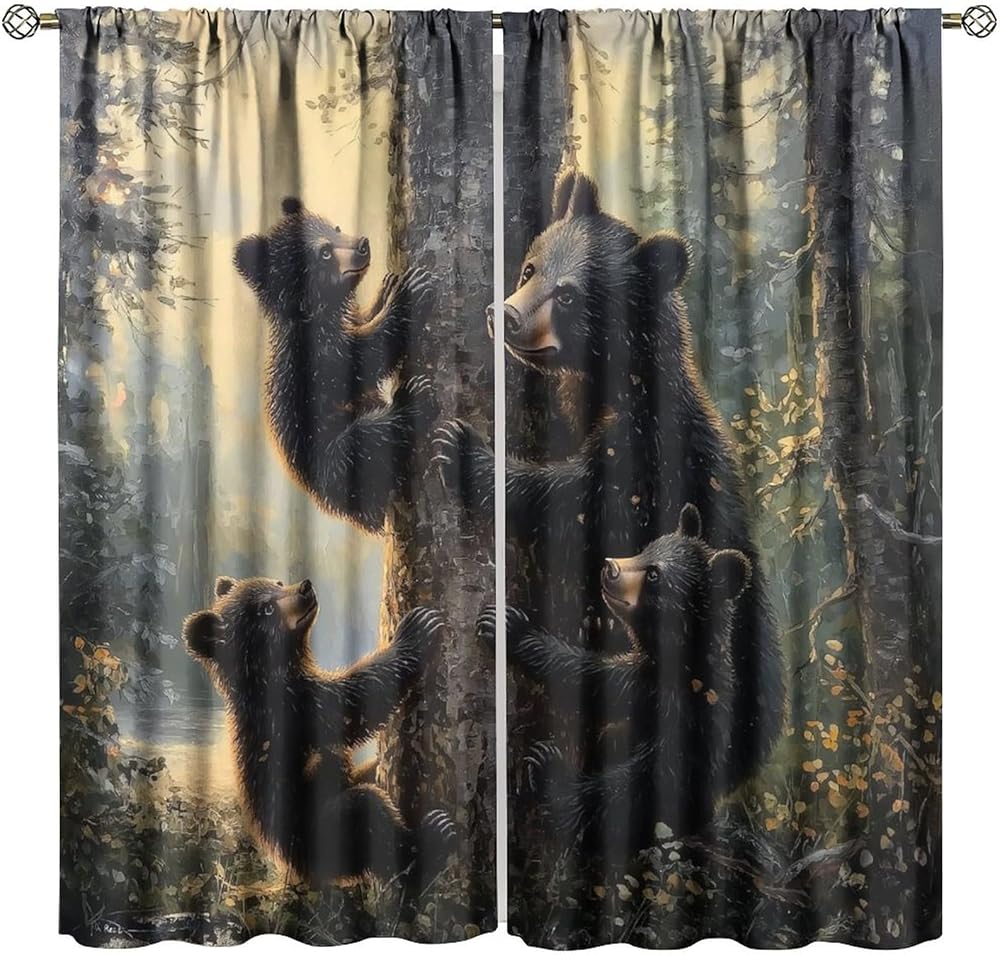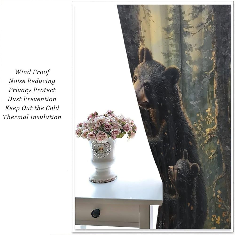 Bear Blackout Curtains, Retro Funny Forest Animal Woodland Wildlife Pattern Drapes, Black Bear Window Treatments Curtain for Kitchen Bedroom Living Room Home Decor 42" W x 45" L